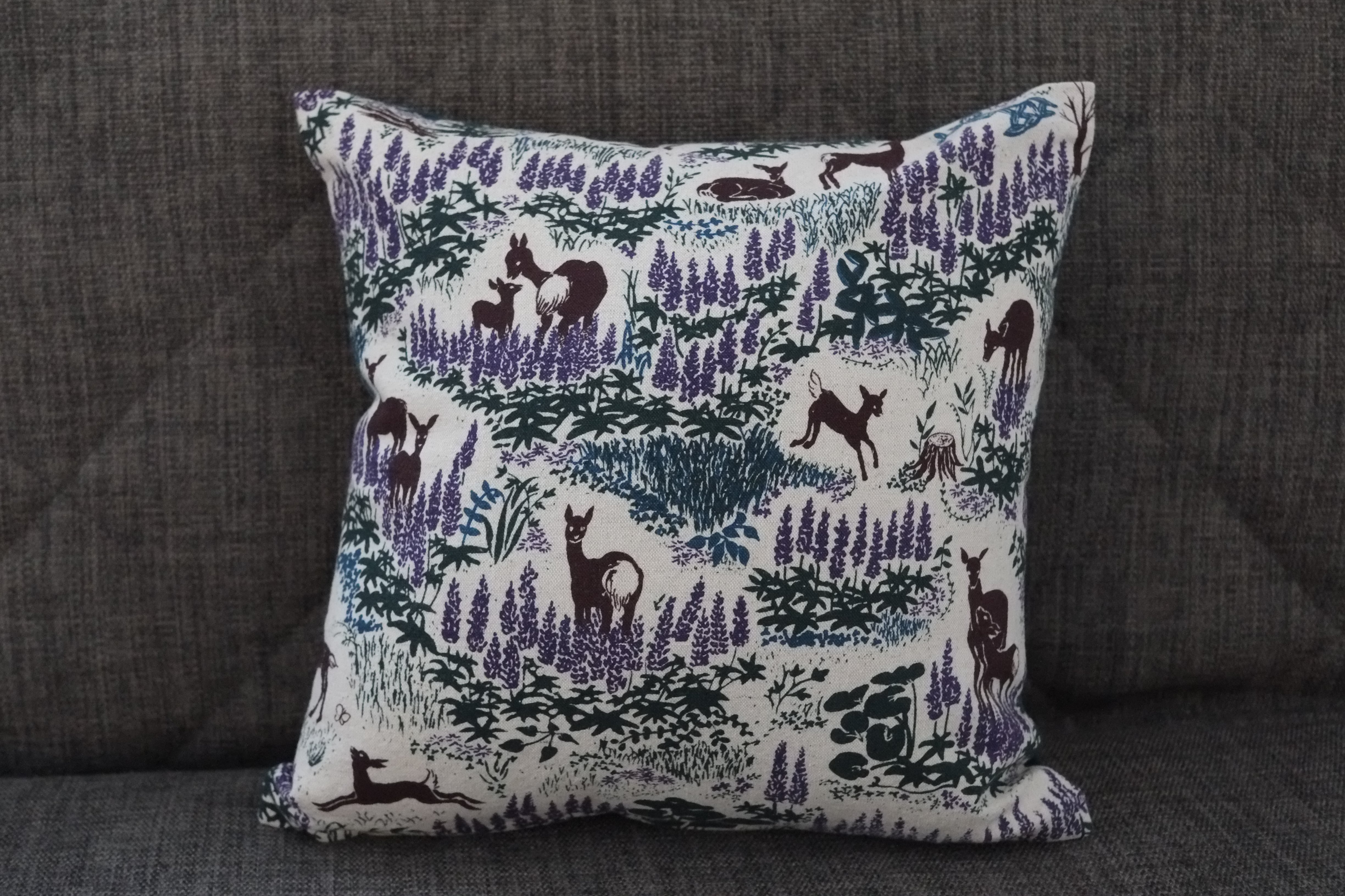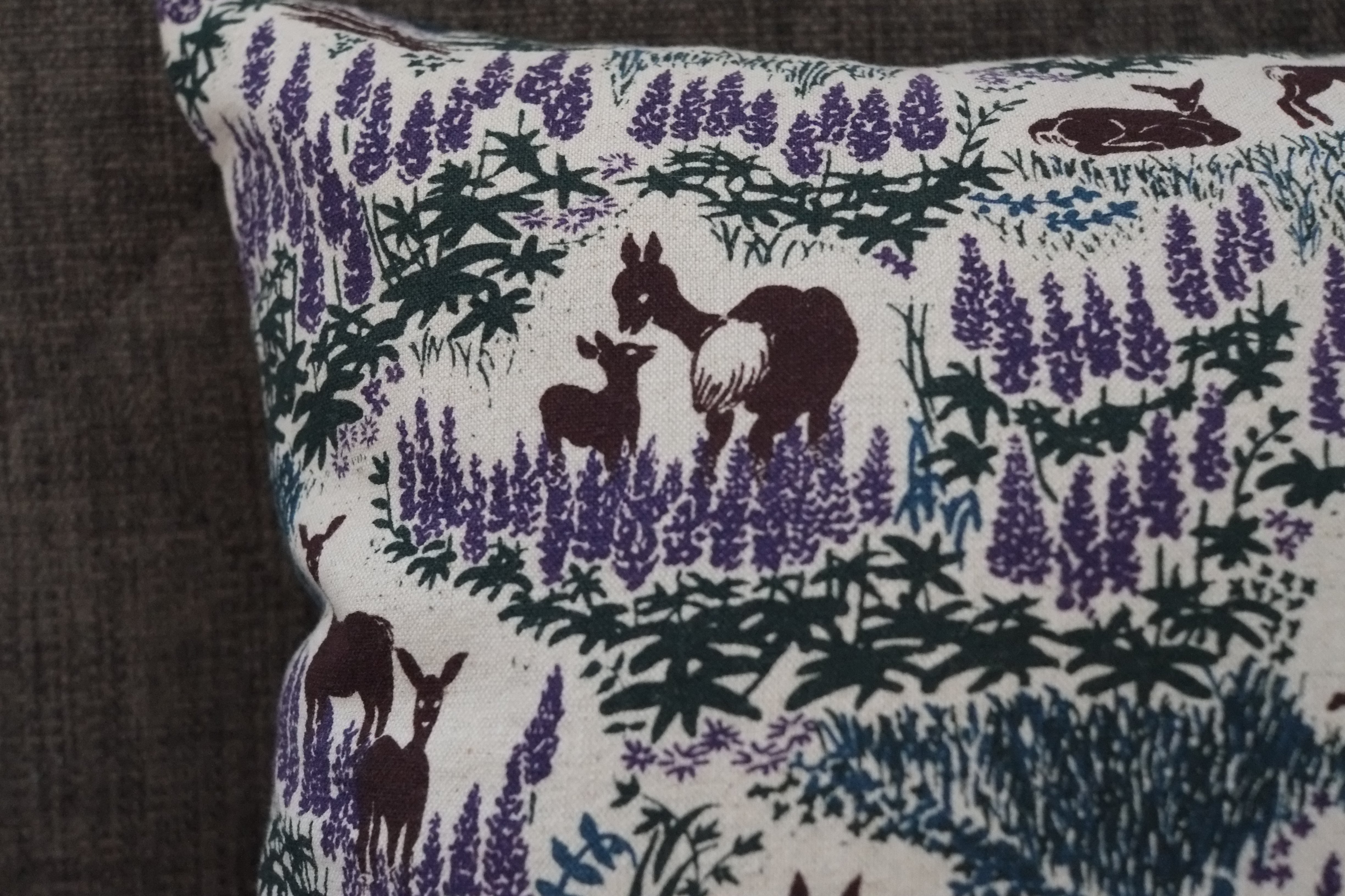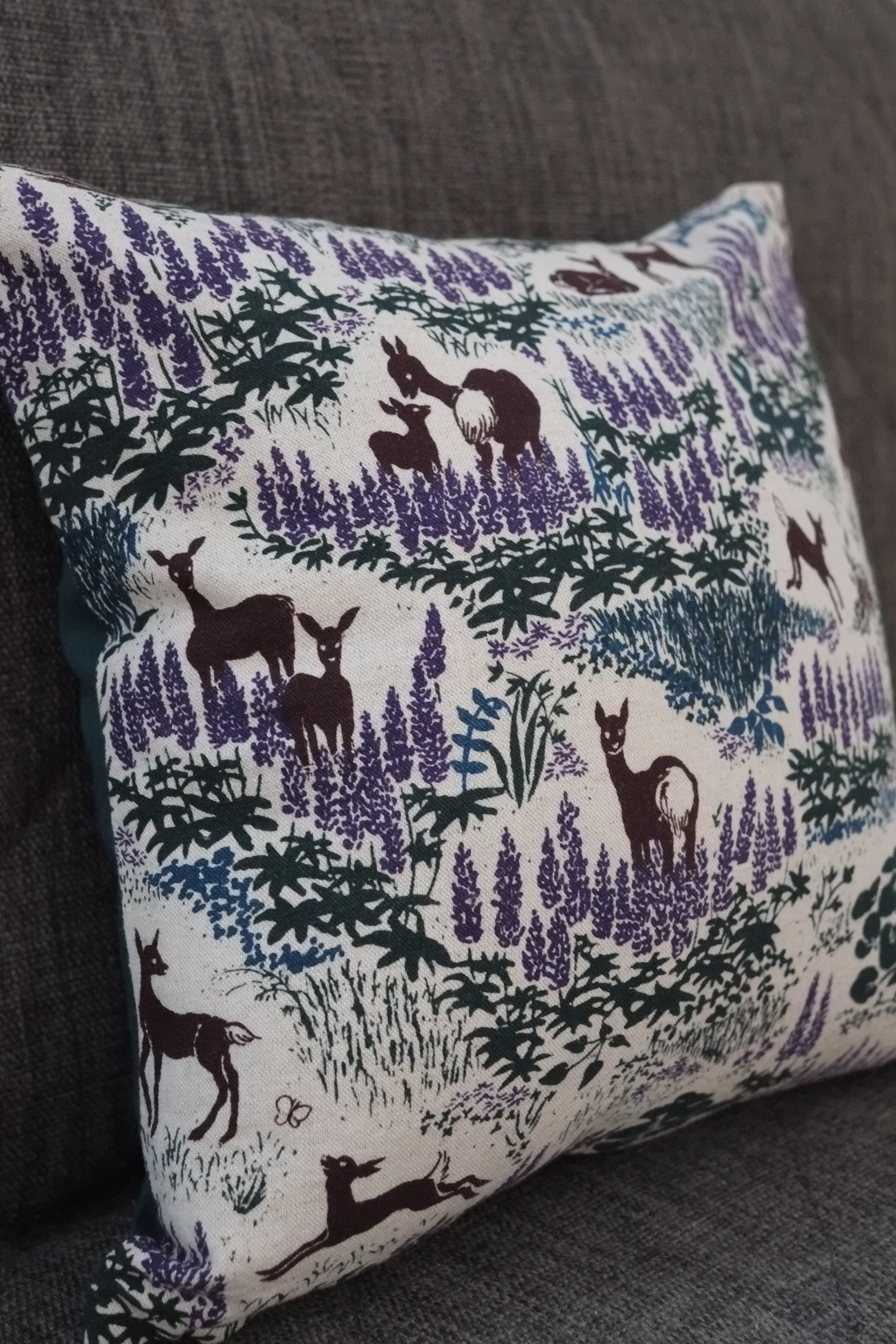 ルピナスの花畑で飛び回る鹿の絵柄を染めた生地を、30センチ角クッション用のカバーに仕立てました。