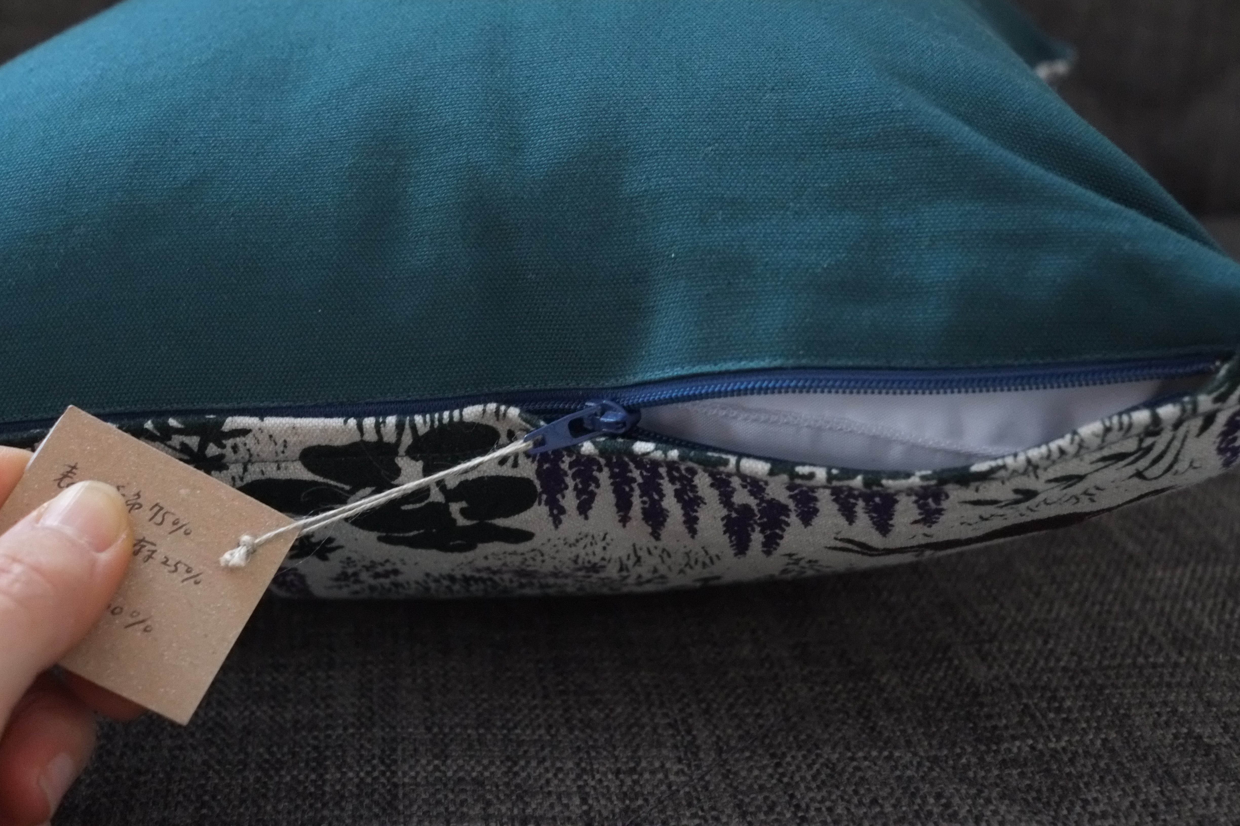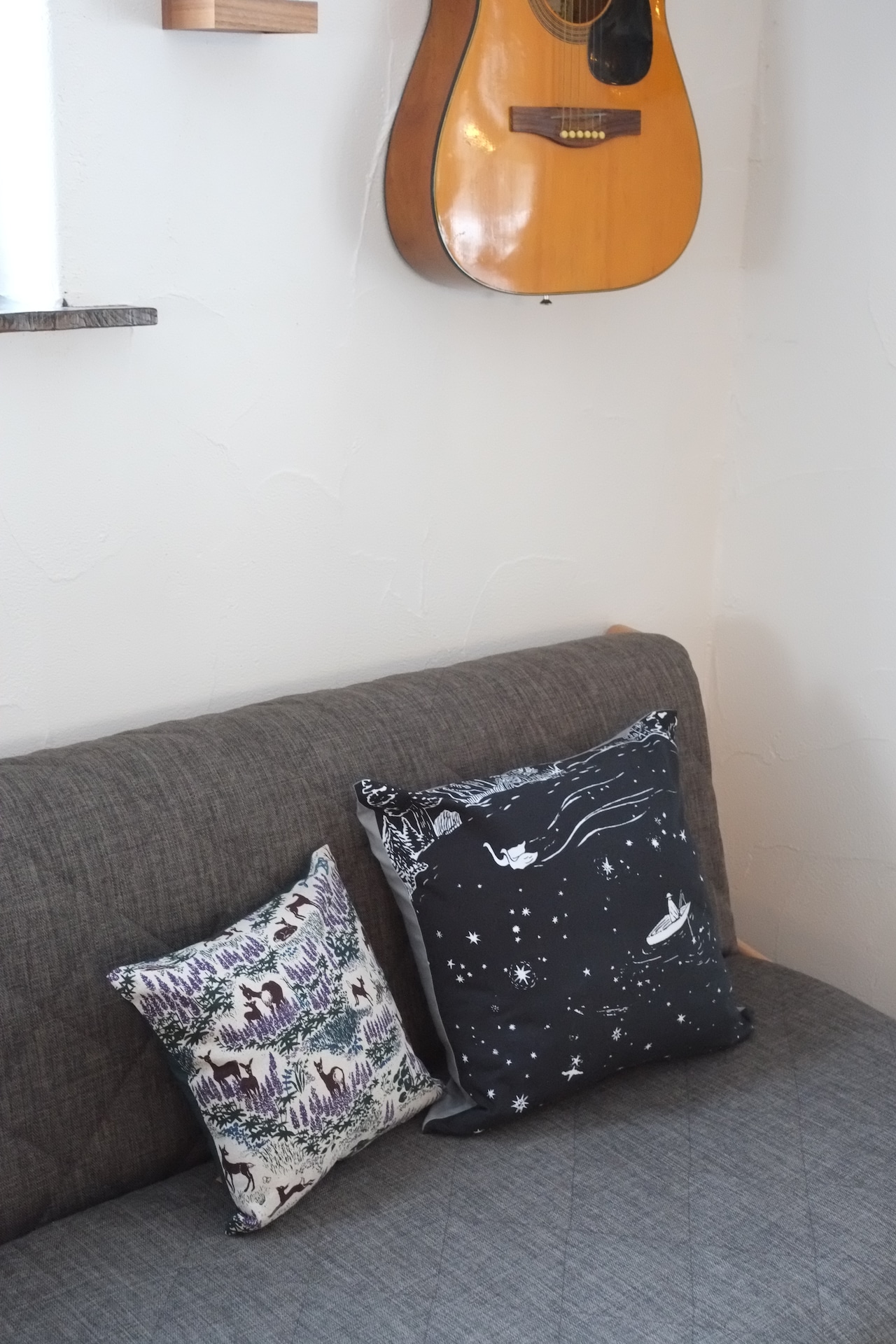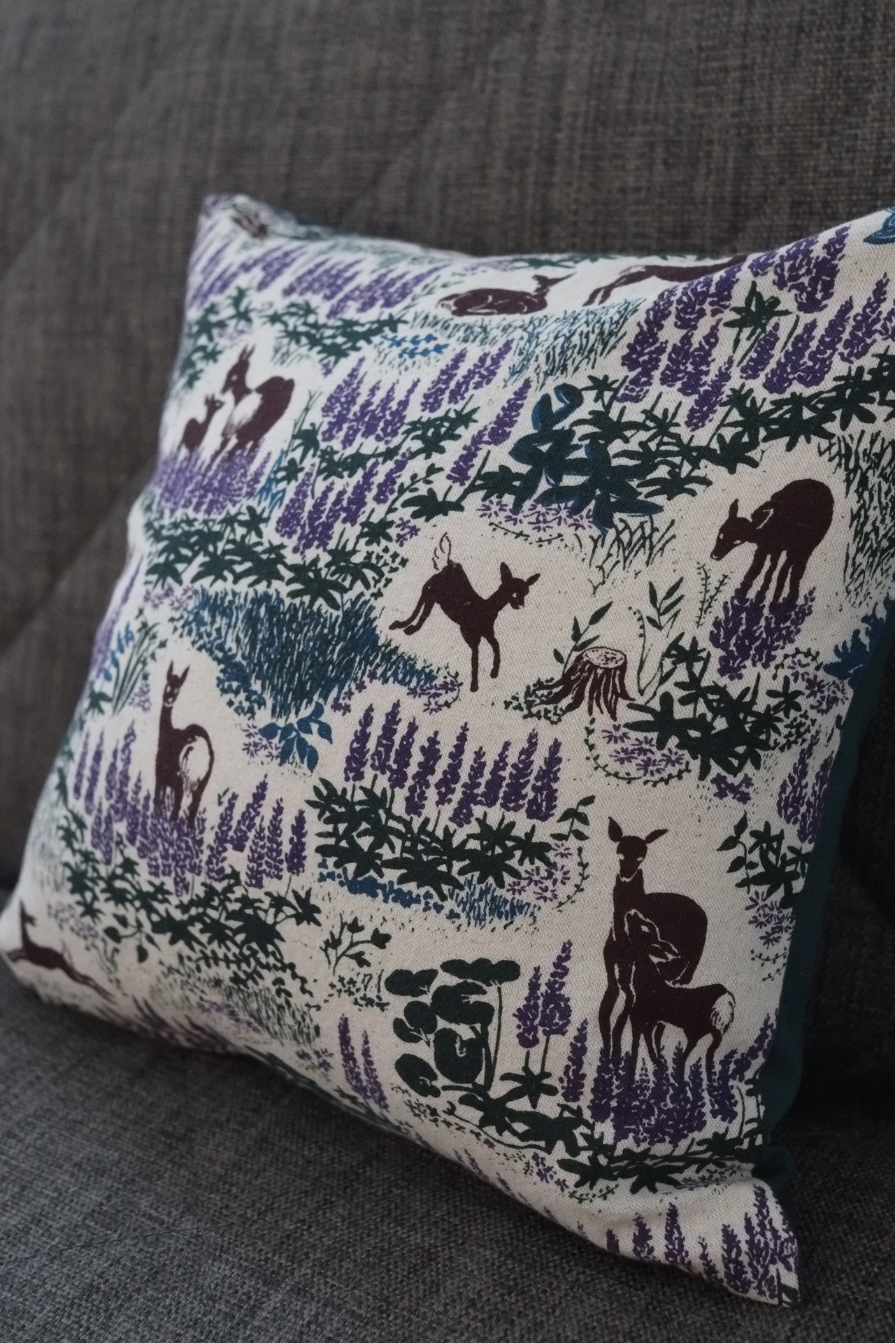ルピナスの花畑で飛び回る鹿の絵柄を染めた生地を、30センチ角クッション用のカバーに仕立てました。