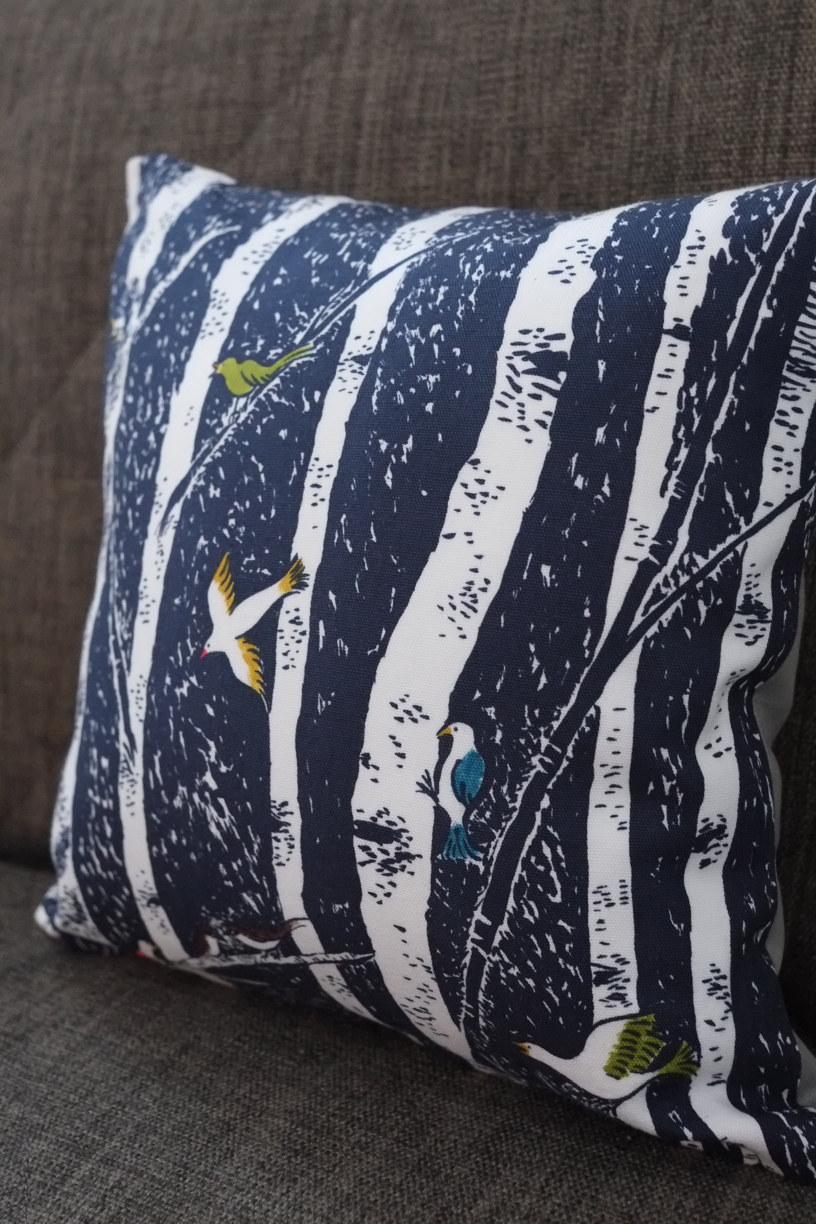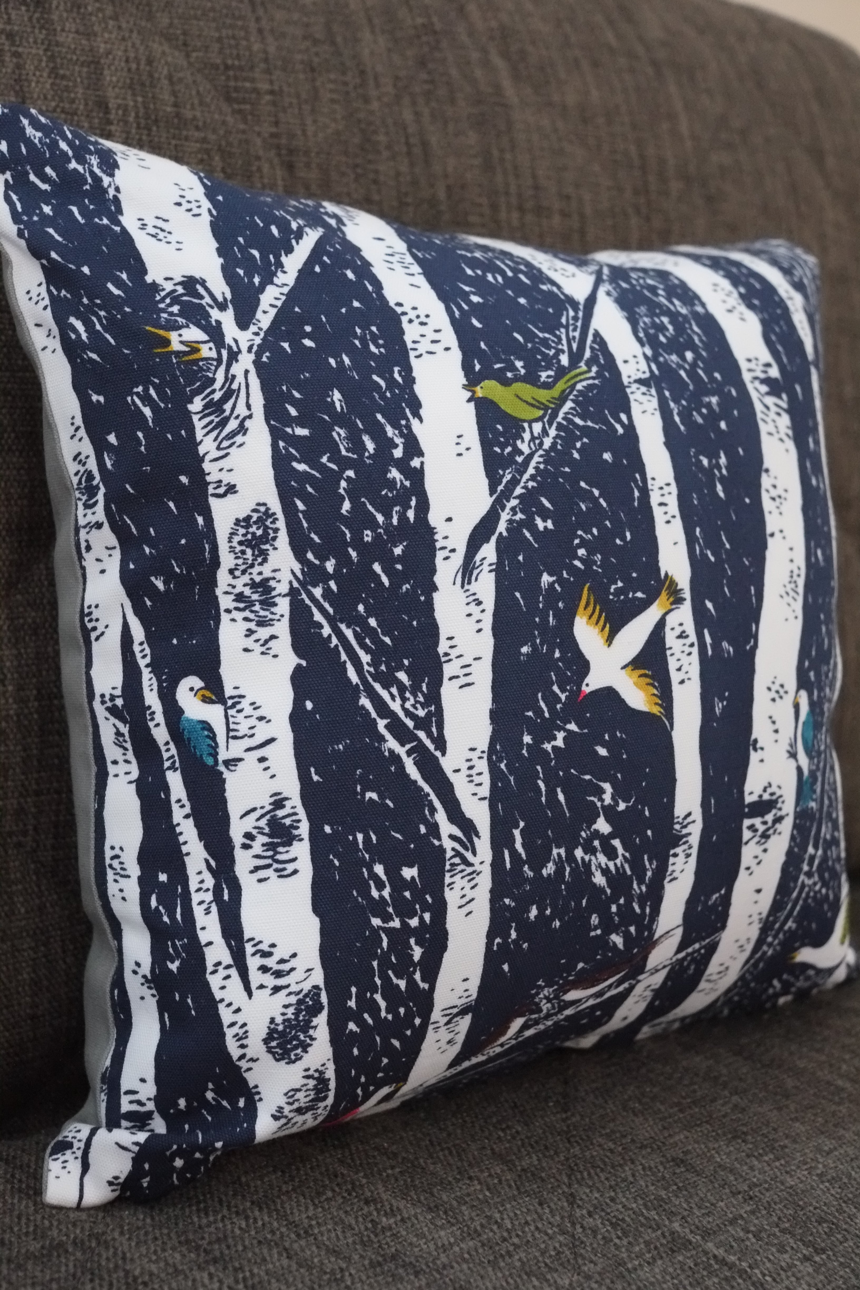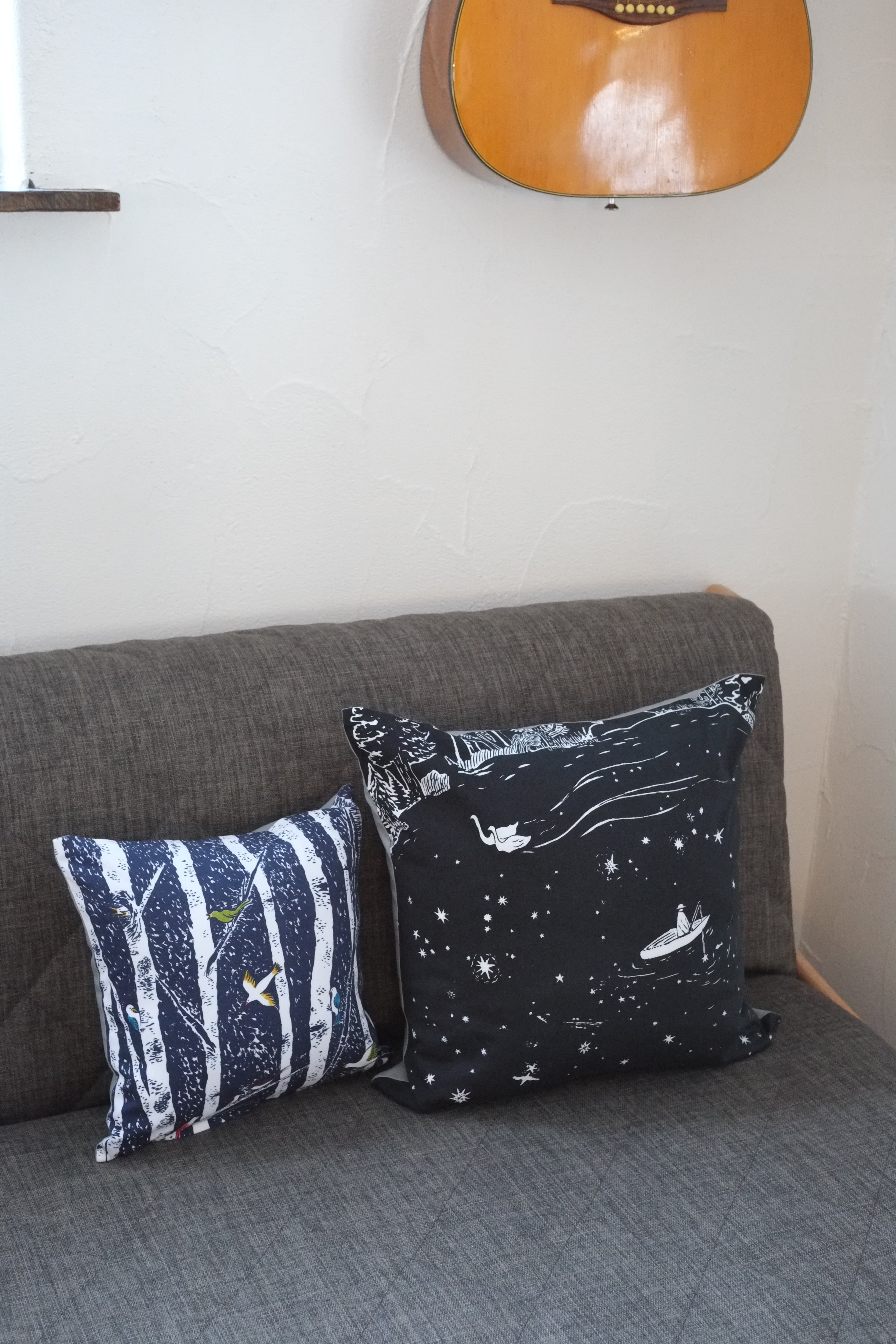 『夜明けのうた』の柄で30センチ角クッション用のカバーを仕立てました。