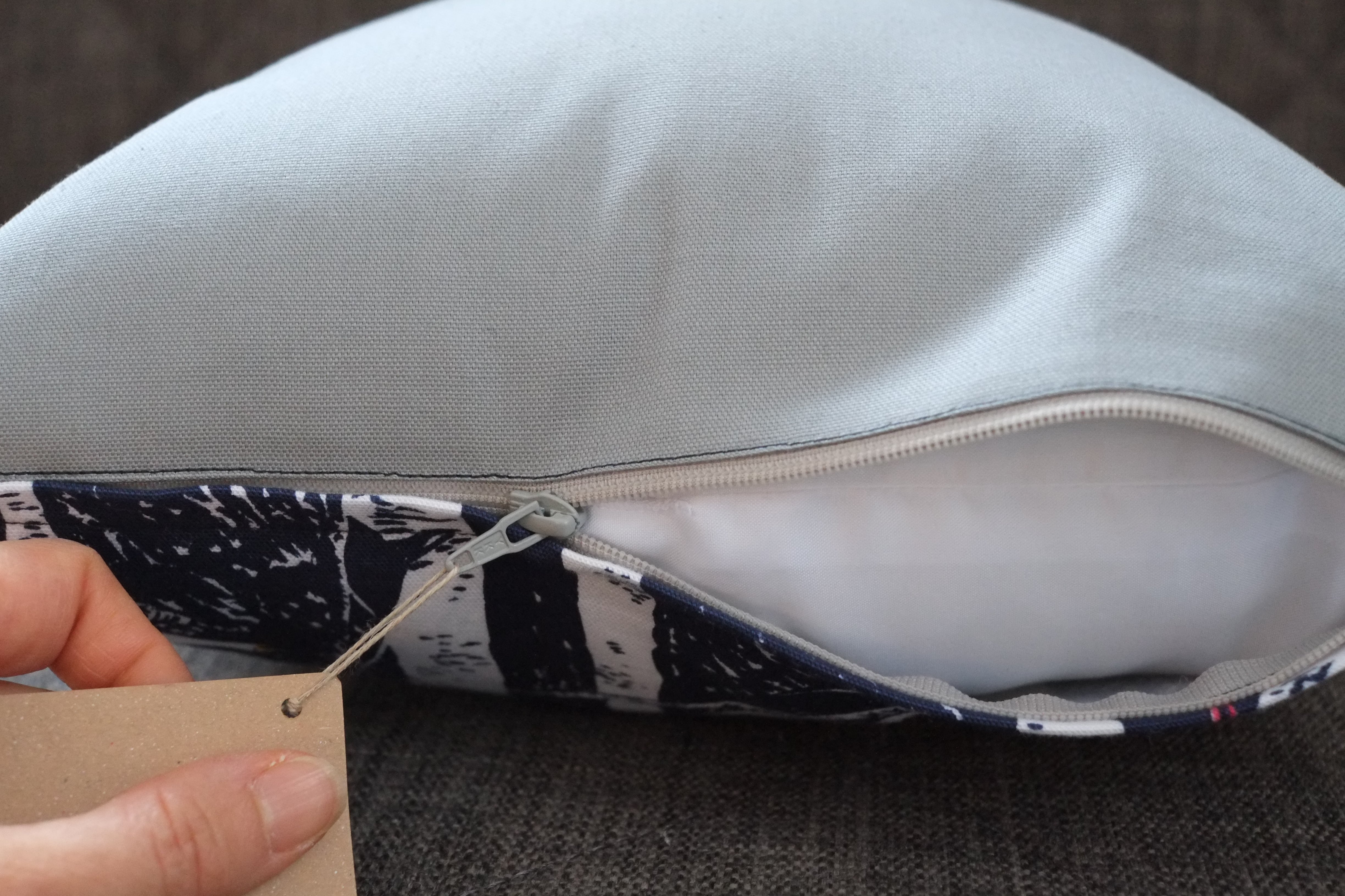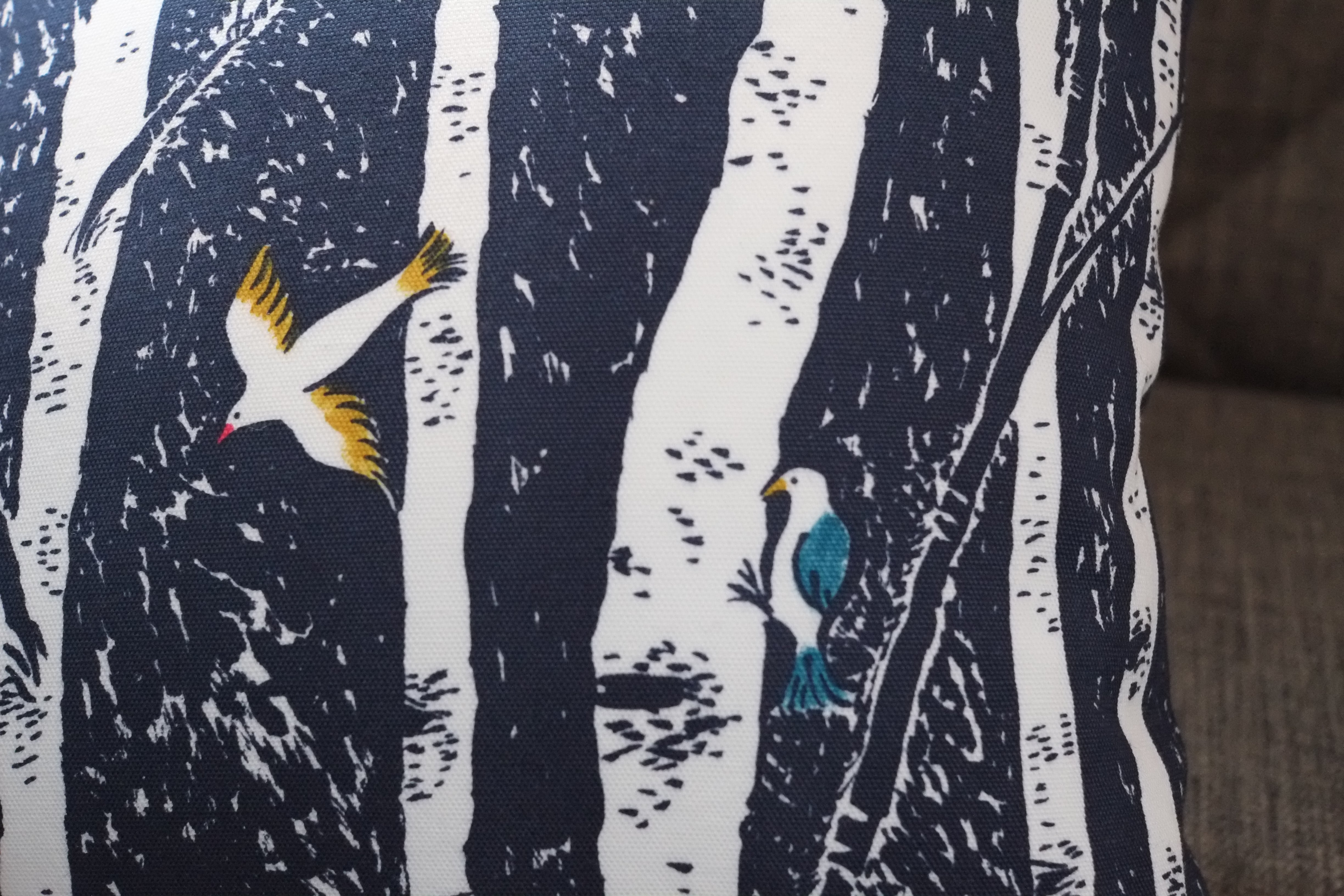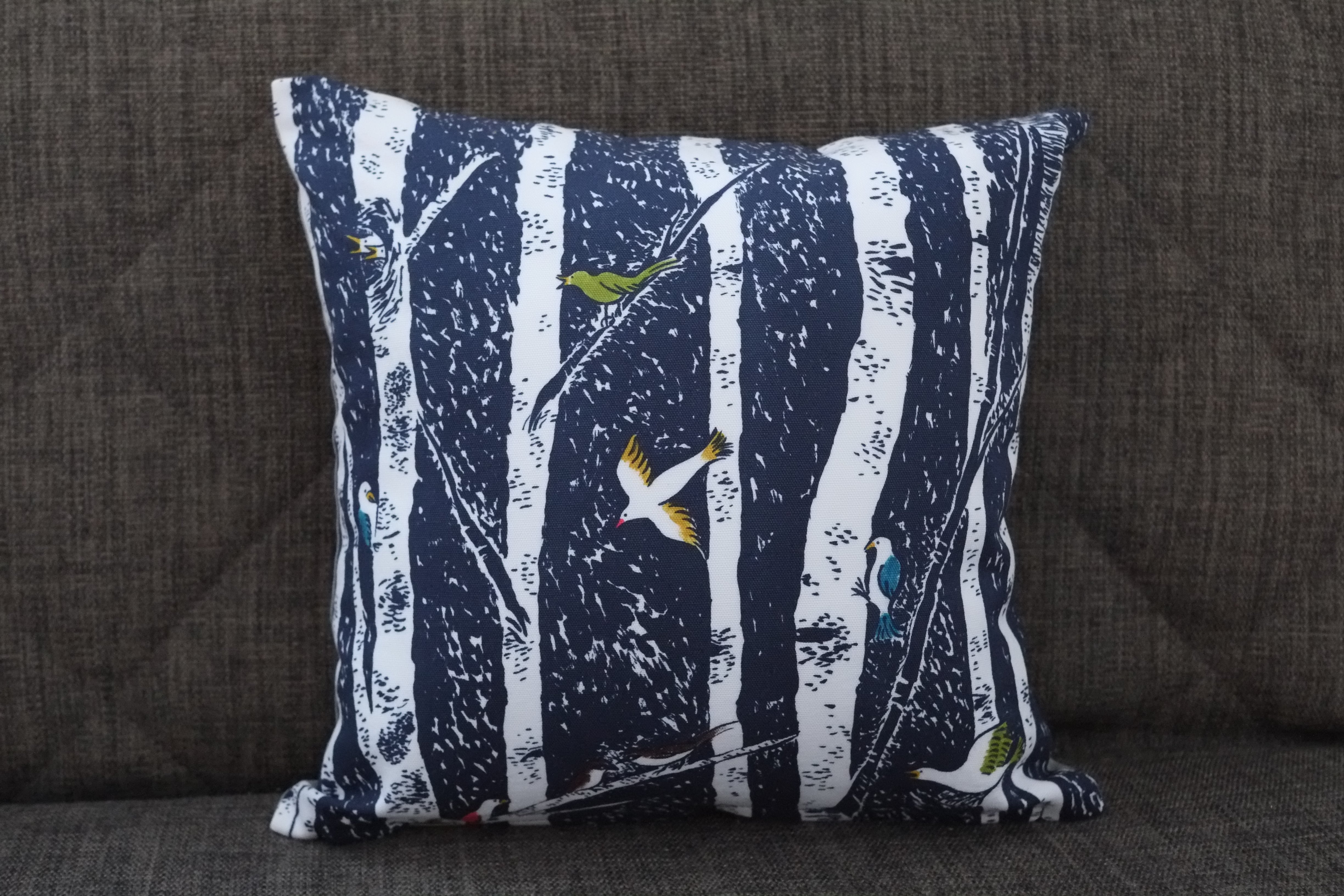 『夜明けのうた』の柄で30センチ角クッション用のカバーを仕立てました。
