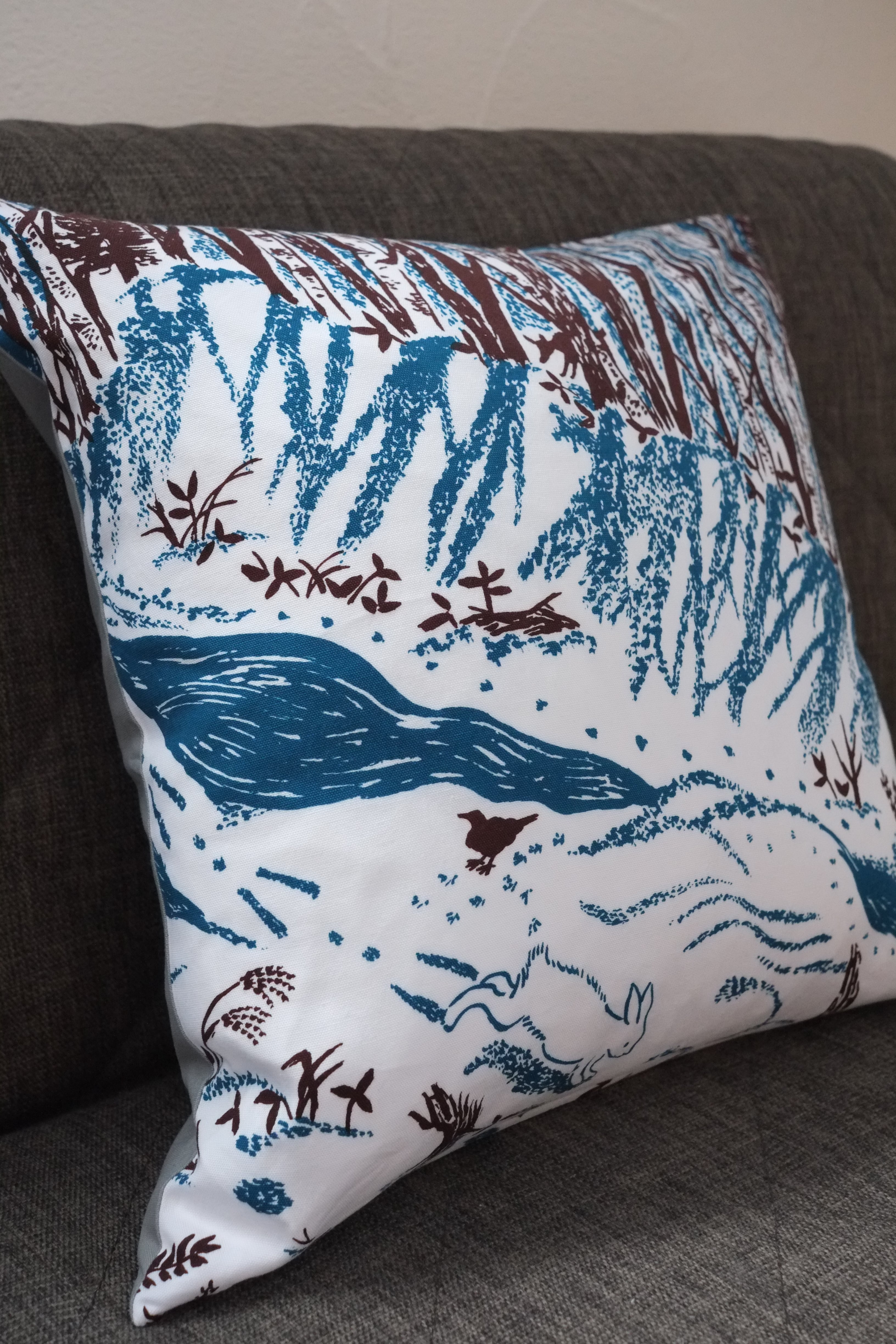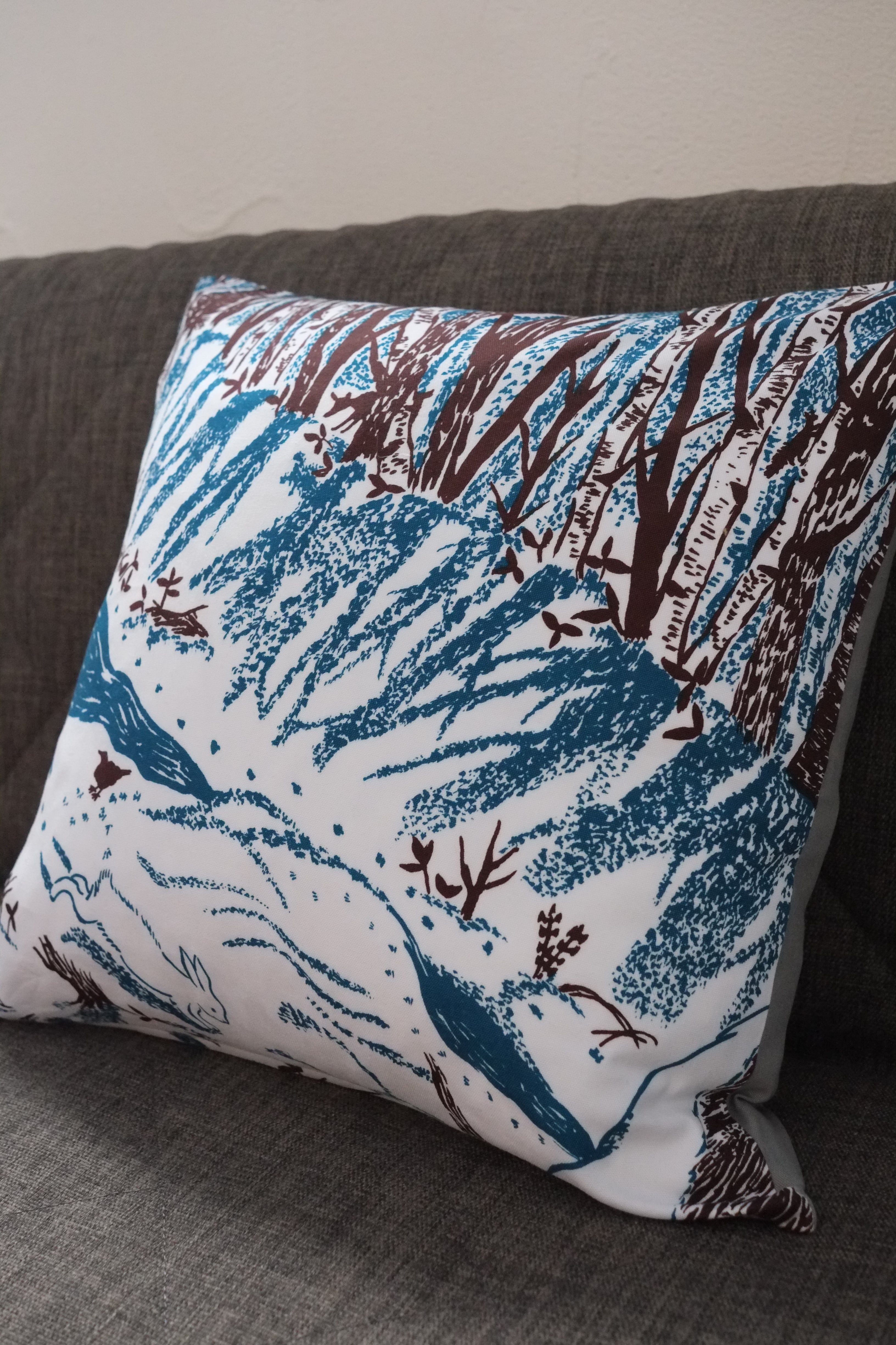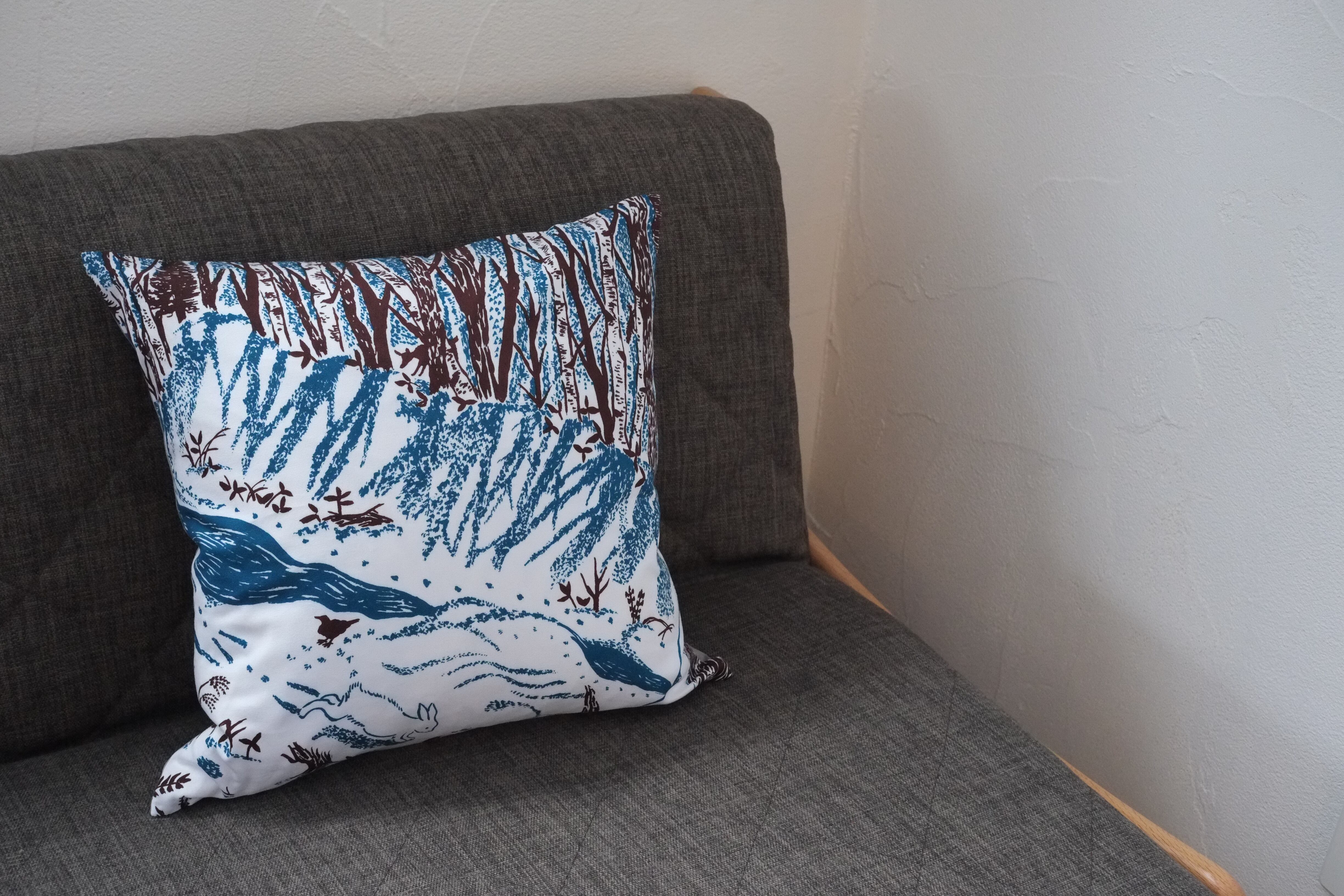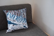 冬の間に散歩した川ぎわや森の景色を染めた生地を、45センチ角クッション用のカバーに仕立てました。