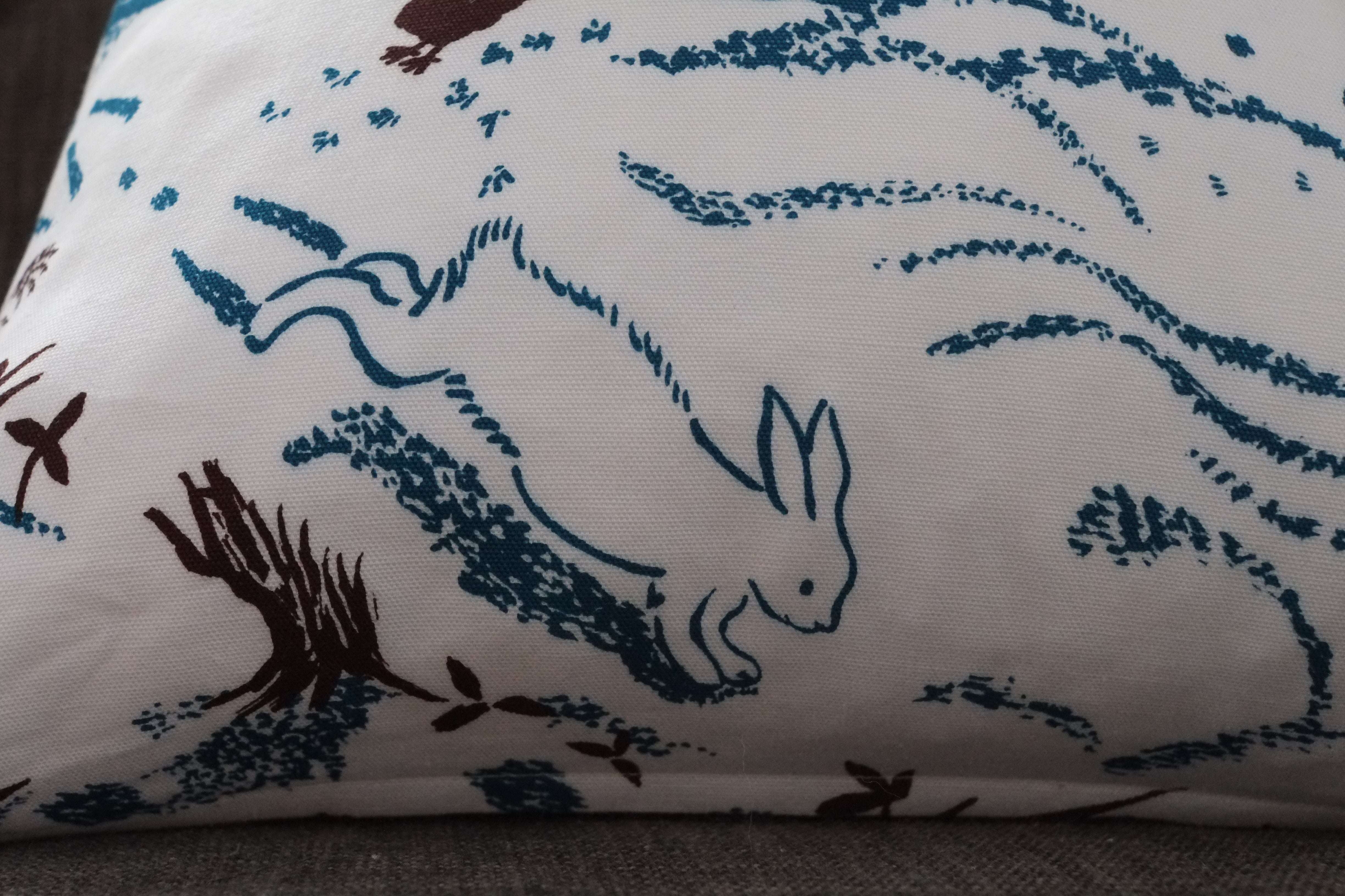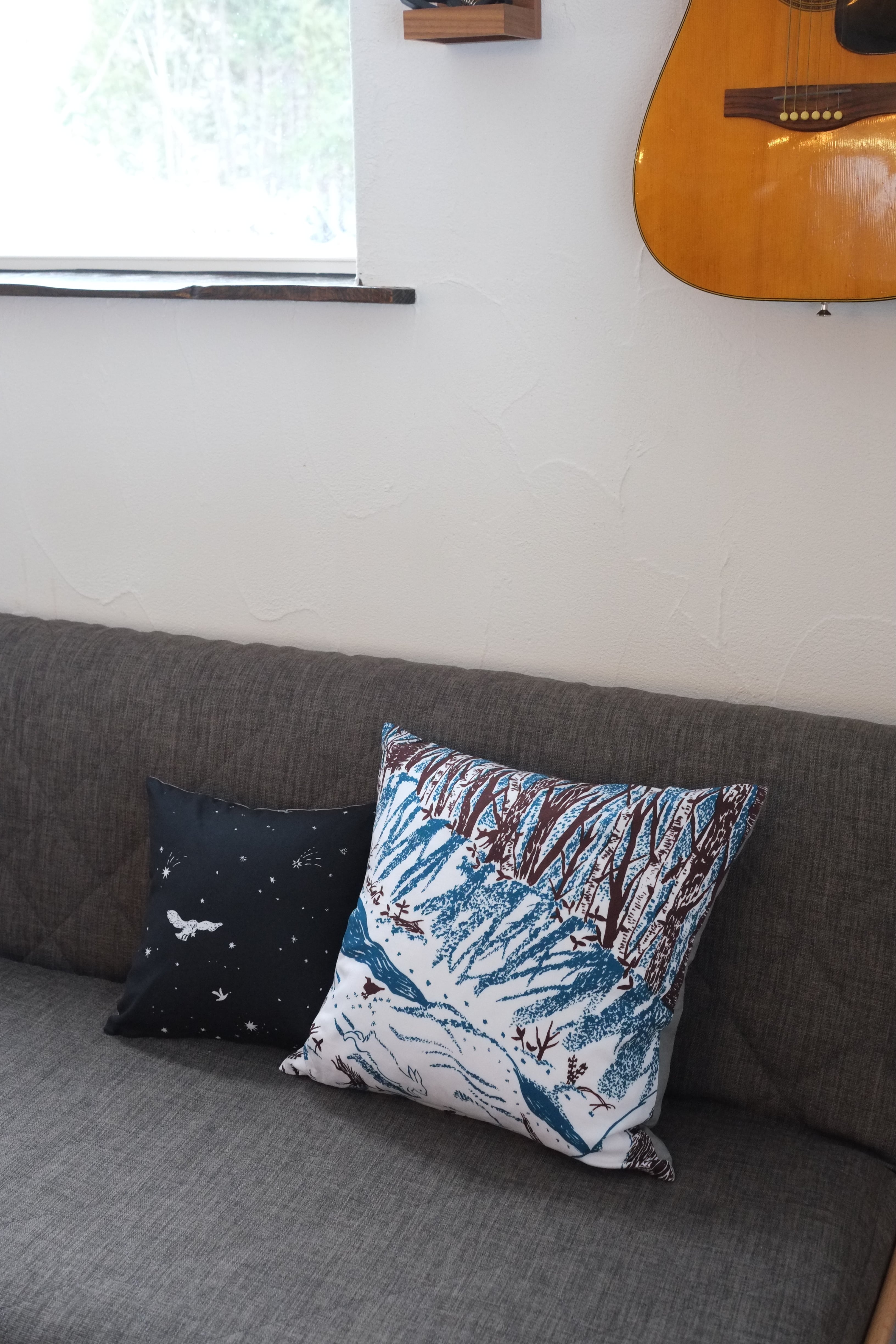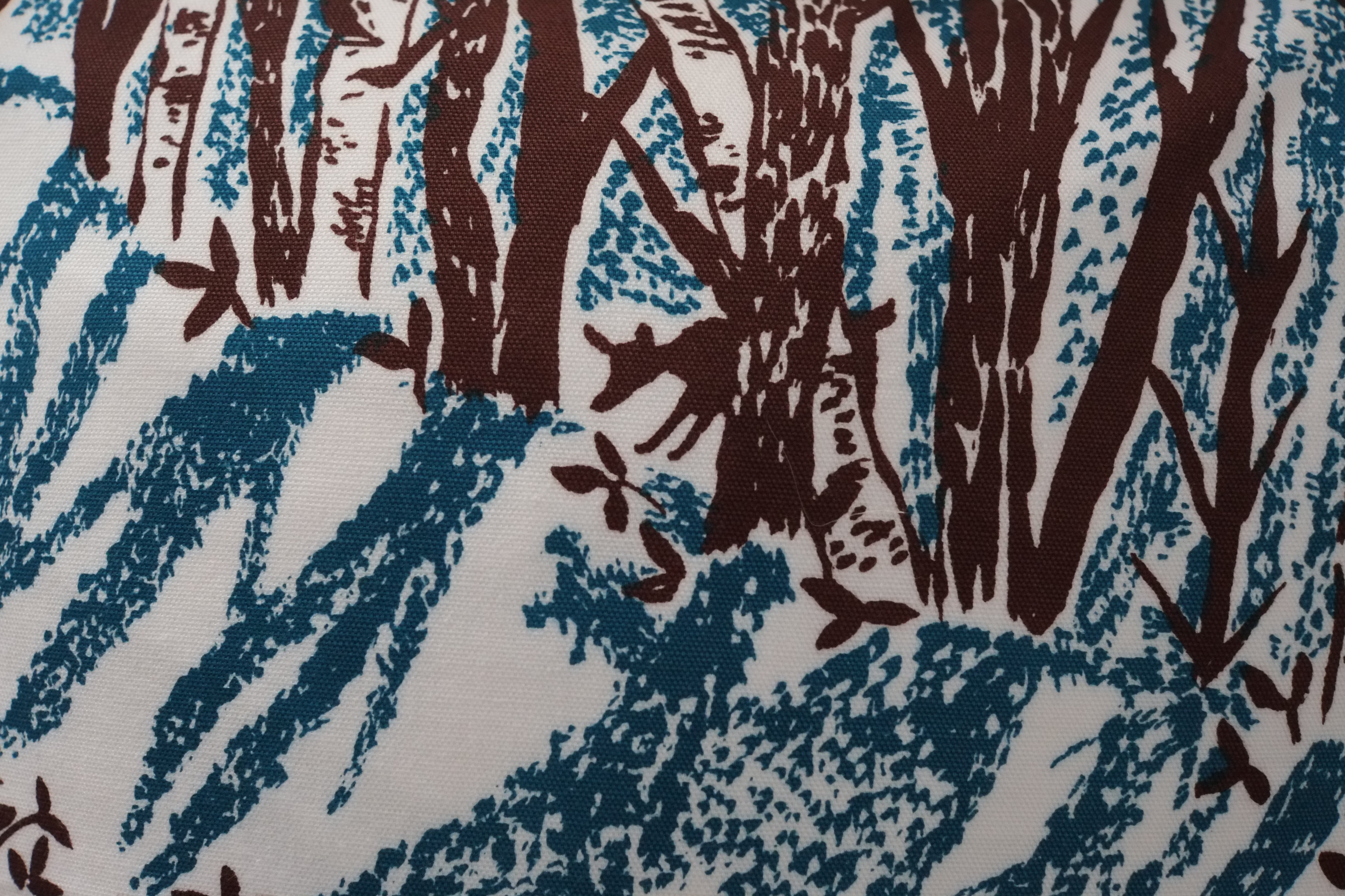 冬の間に散歩した川ぎわや森の景色を染めた生地を、45センチ角クッション用のカバーに仕立てました。