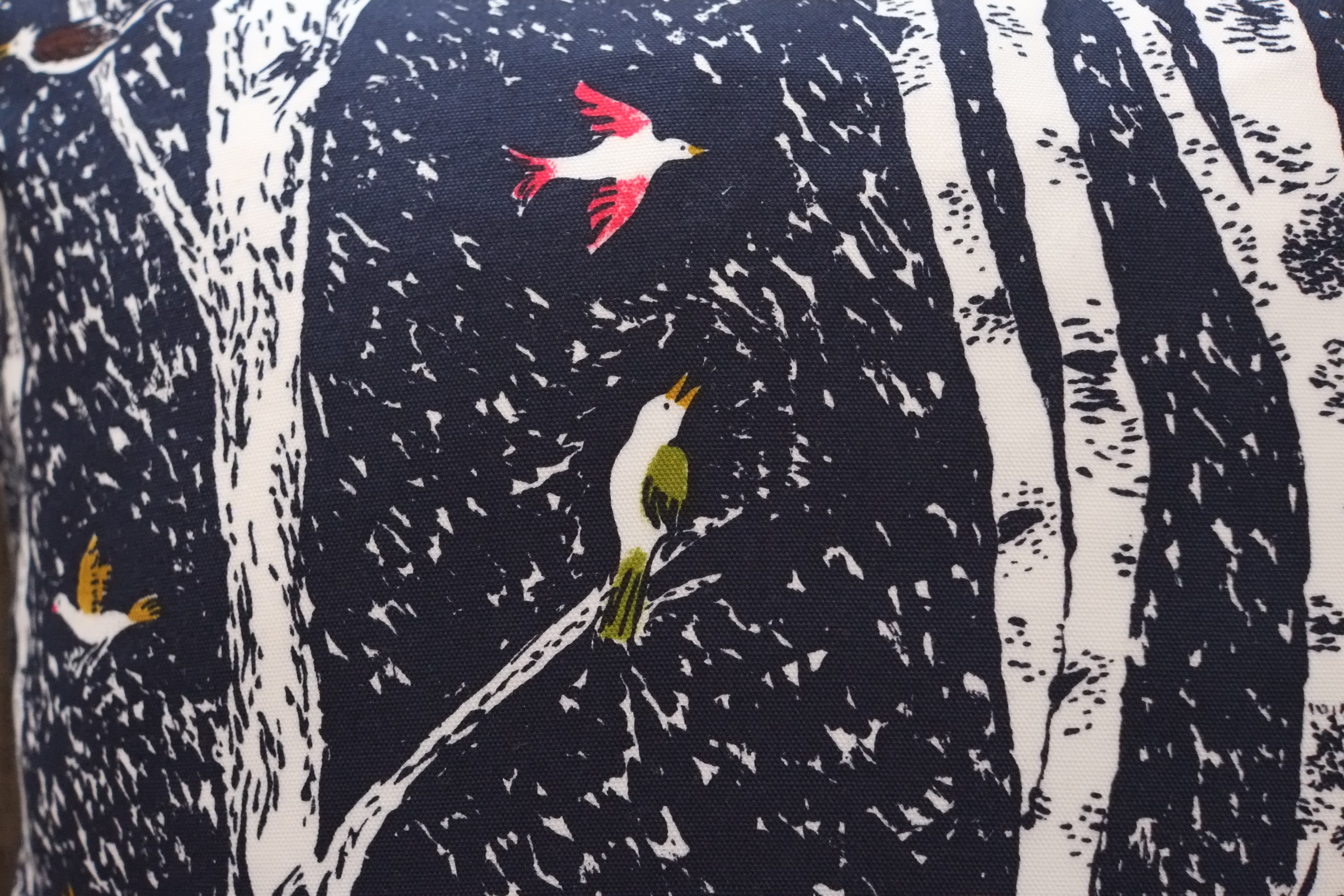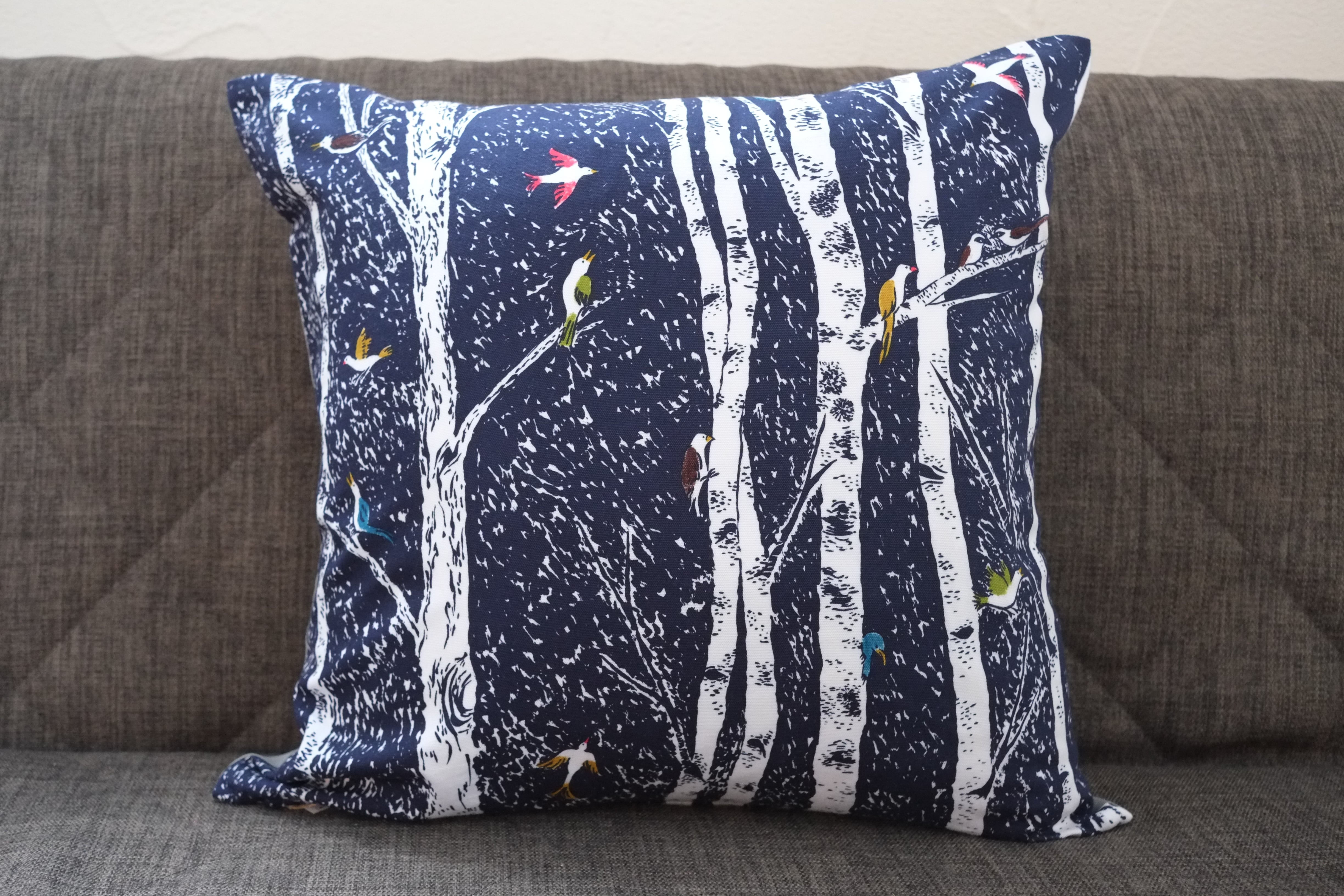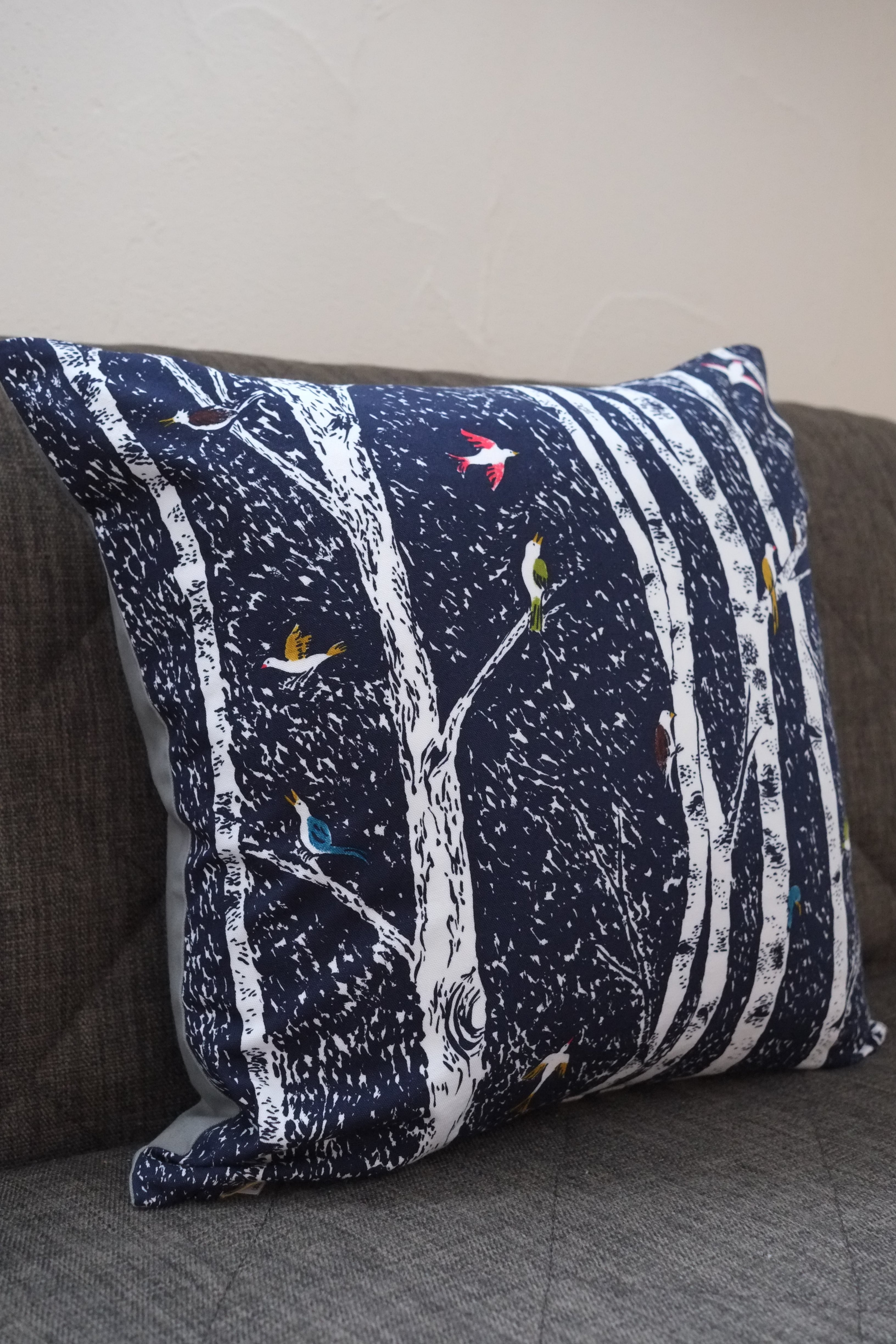 『夜明けのうた』の柄で45センチ角クッション用のカバーを仕立てました。