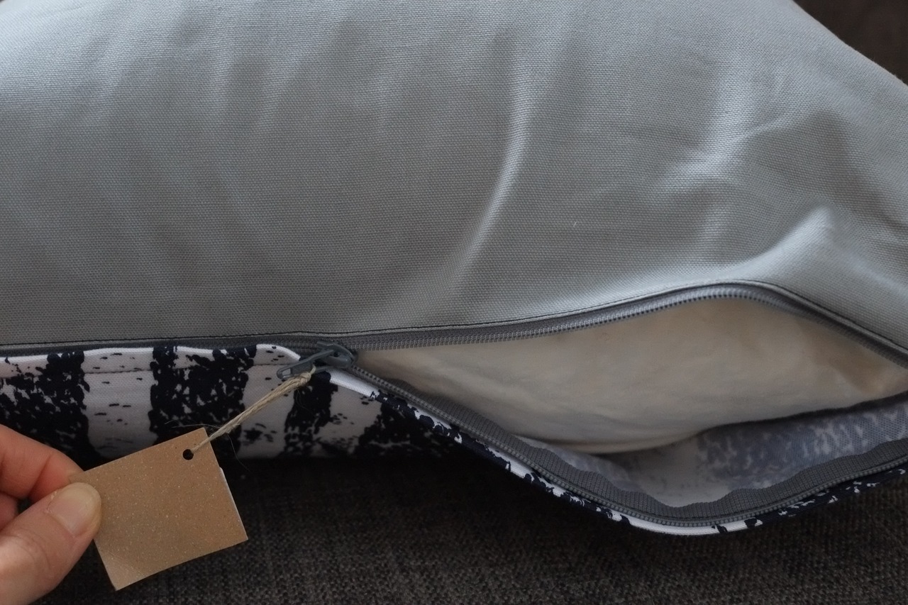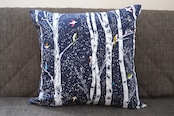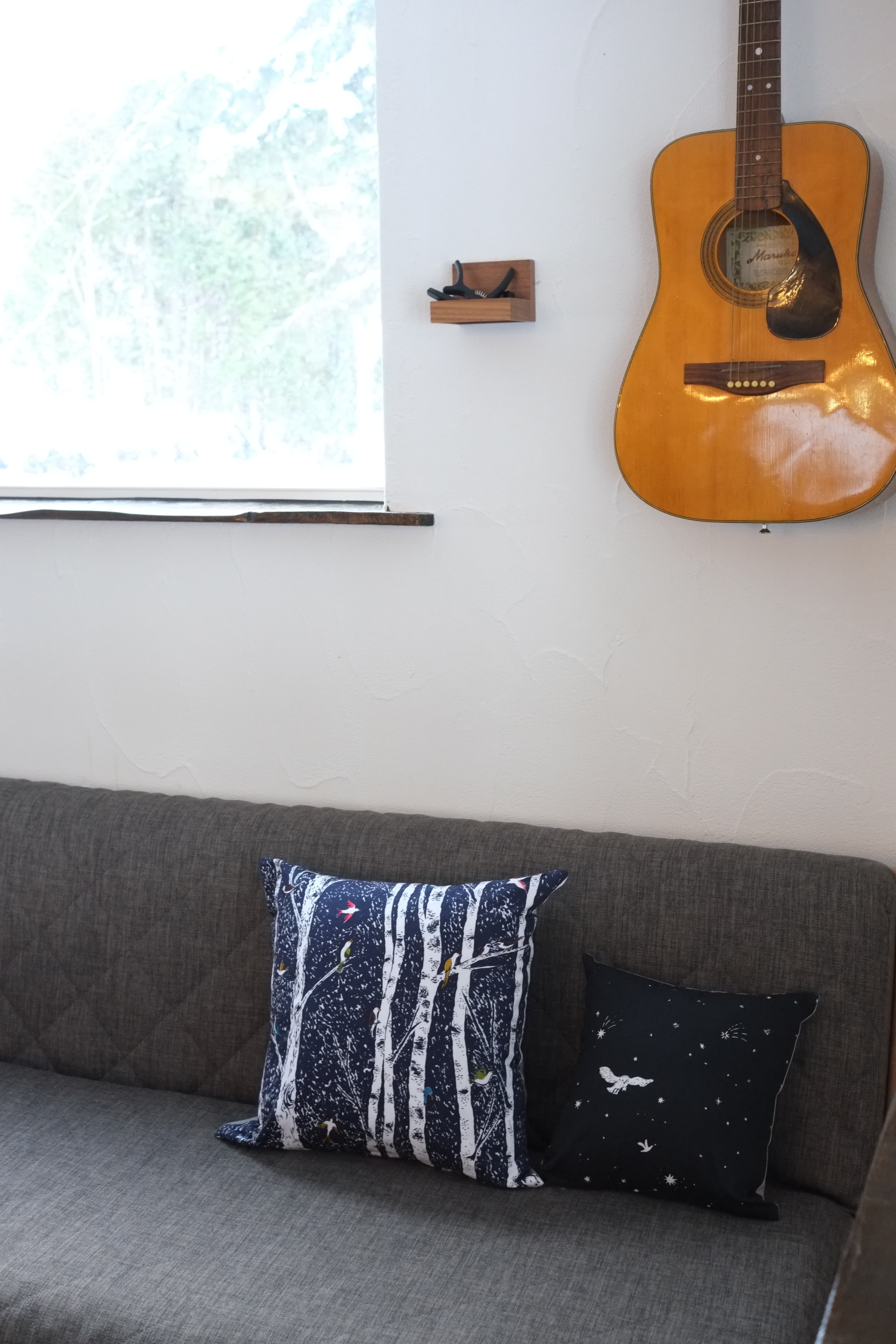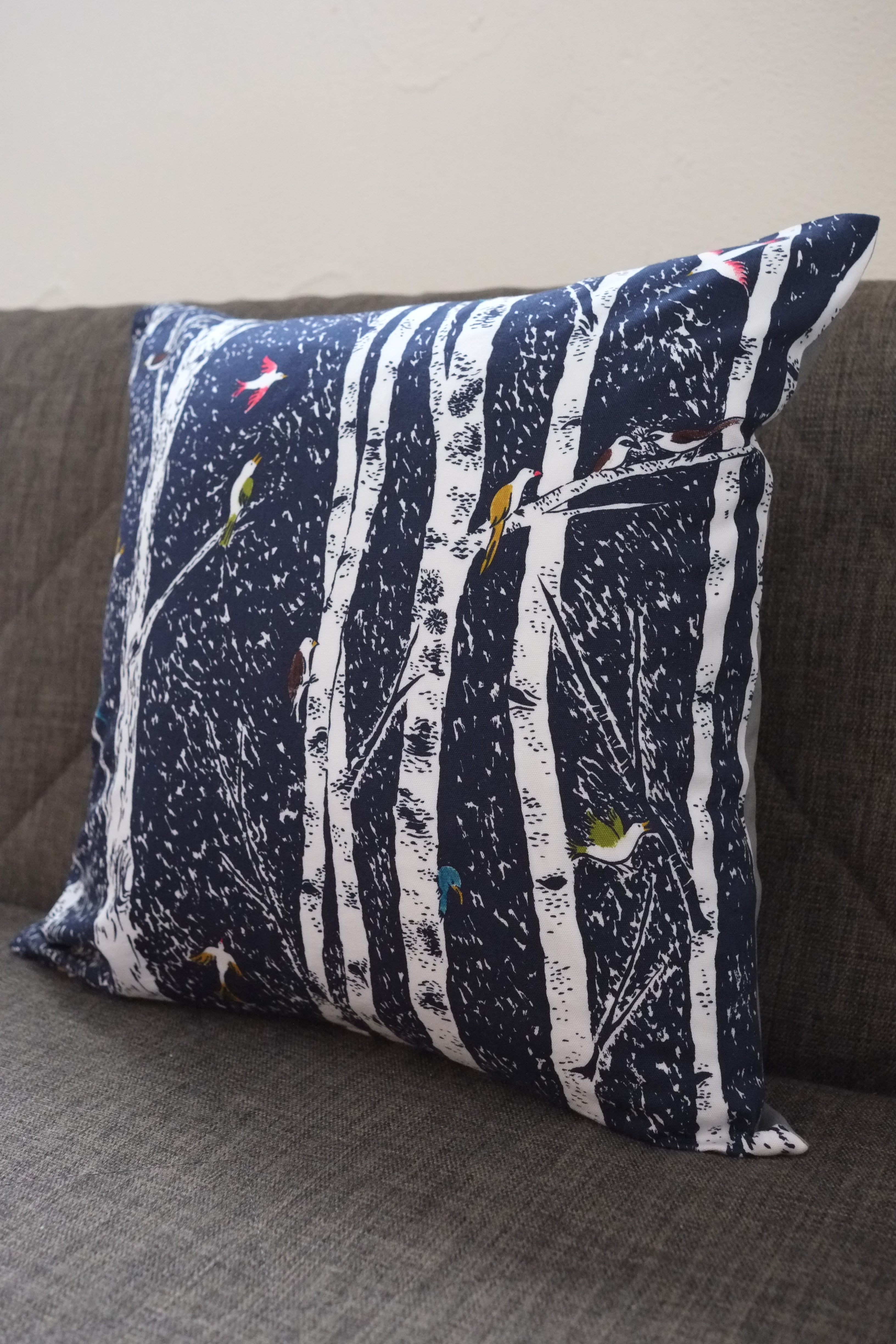 『夜明けのうた』の柄で45センチ角クッション用のカバーを仕立てました。