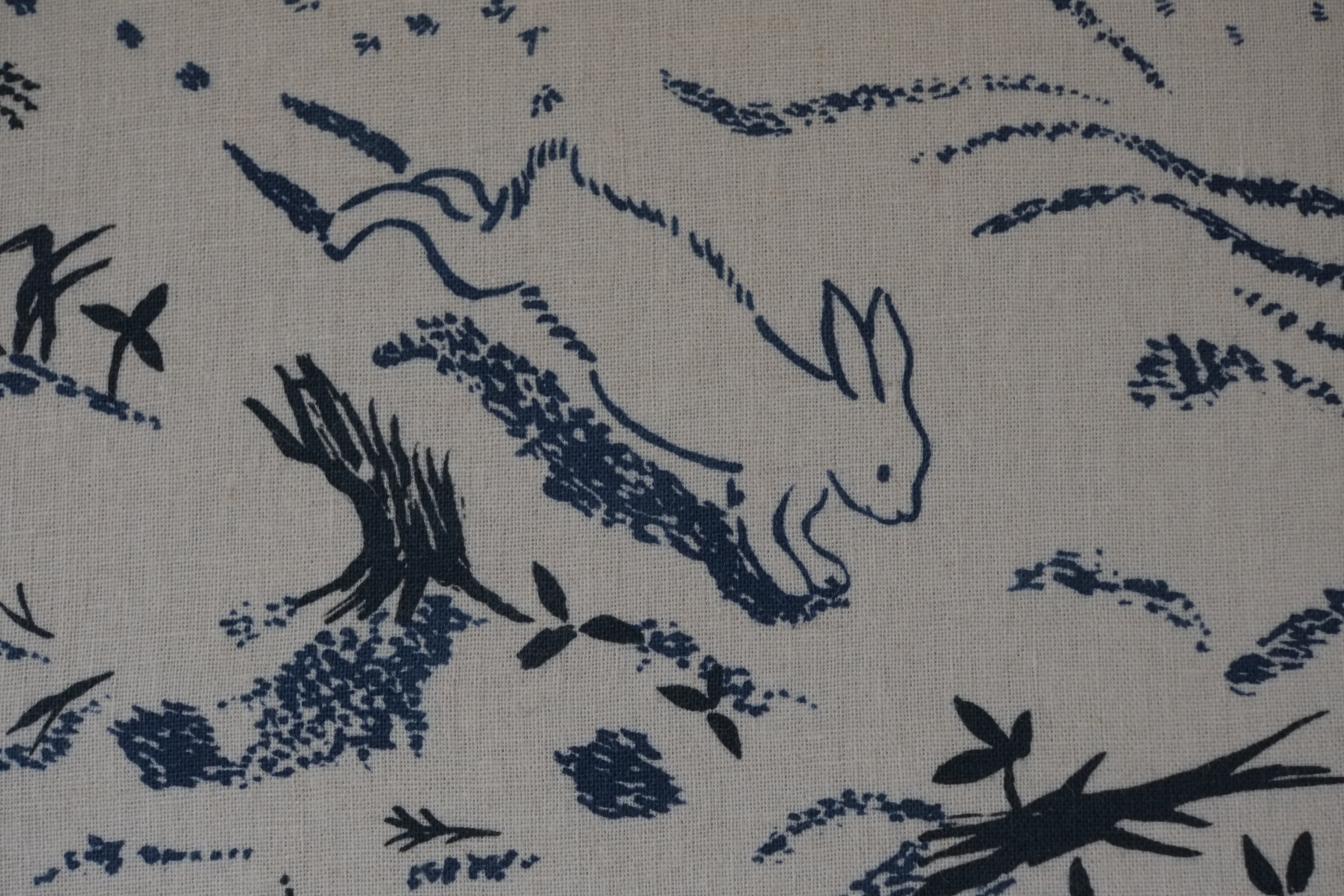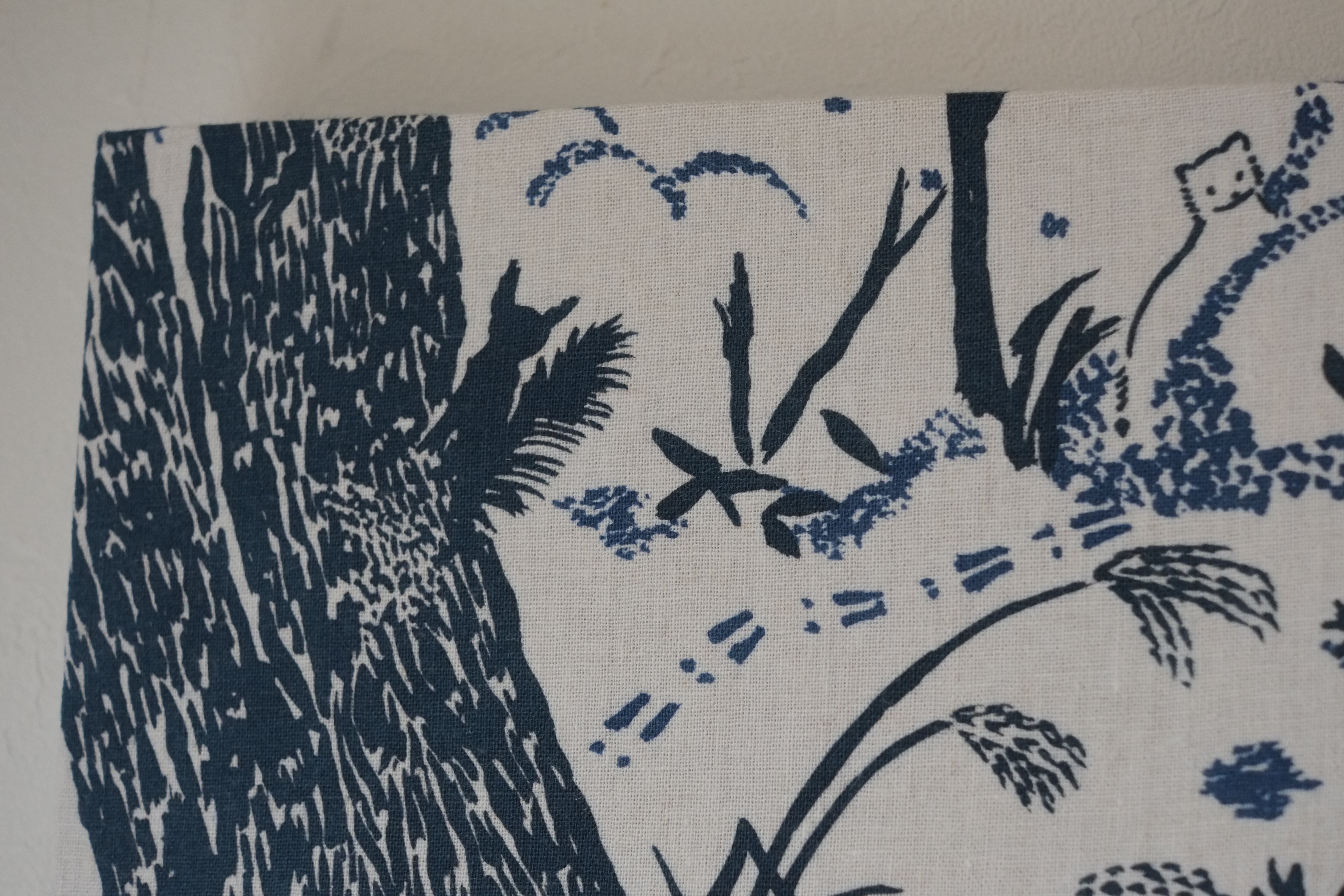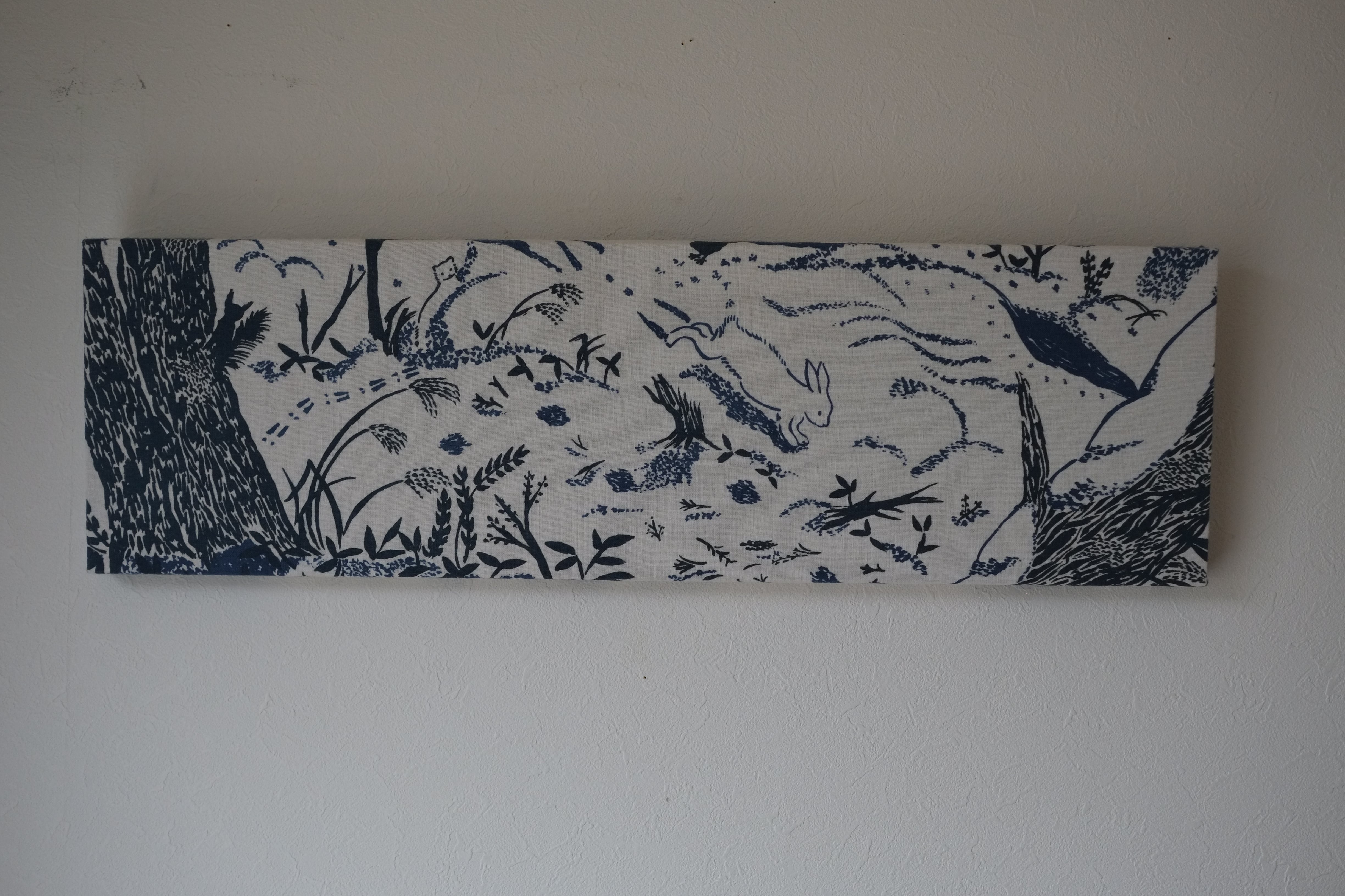 シルクスクリーンの手捺染で冬の間に散歩した川ぎわや森の景色を染め、ファブリックパネルに仕立てました。