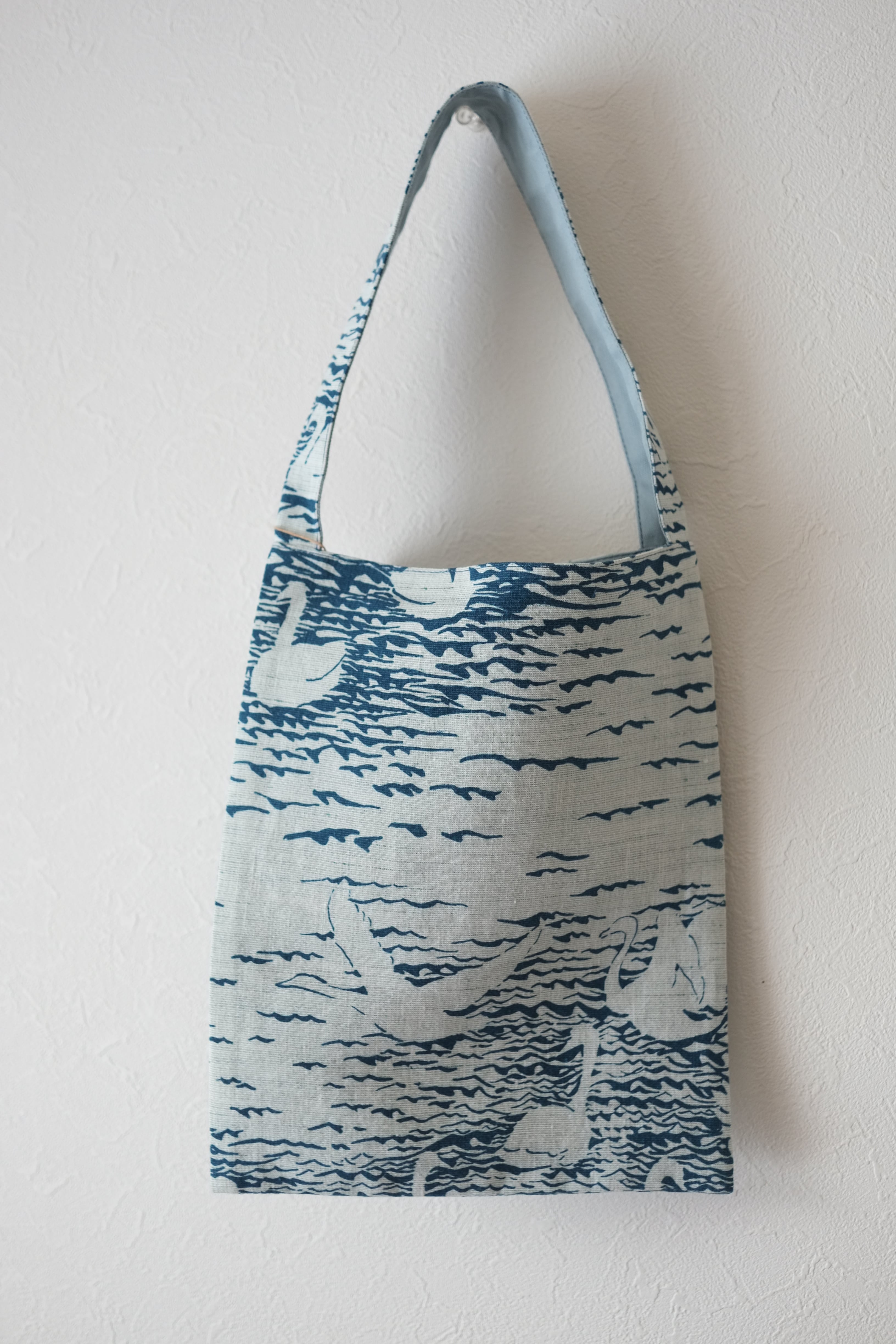 たくさんの白鳥が浮かぶ湖を染めた布をミニバックに仕立てました。