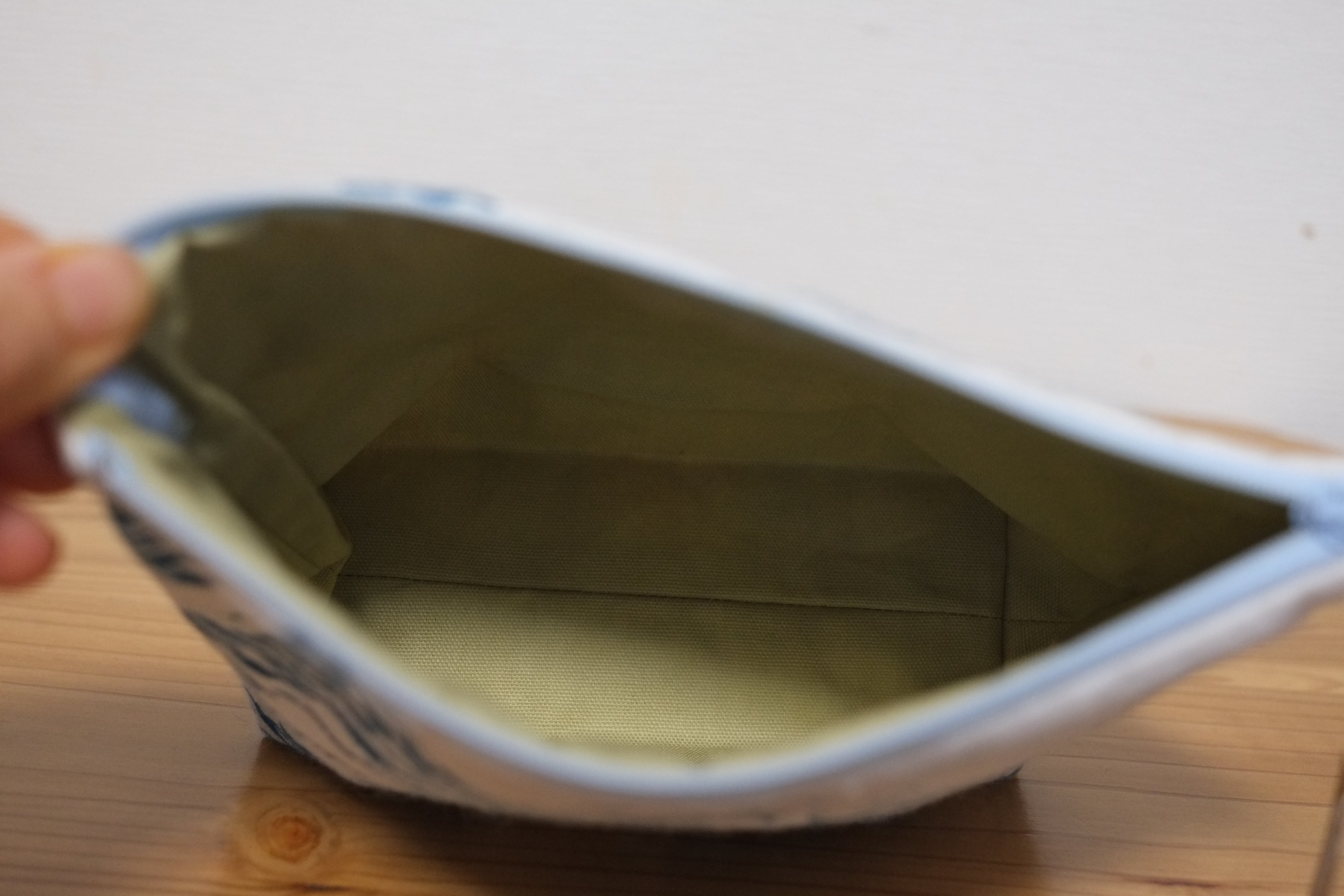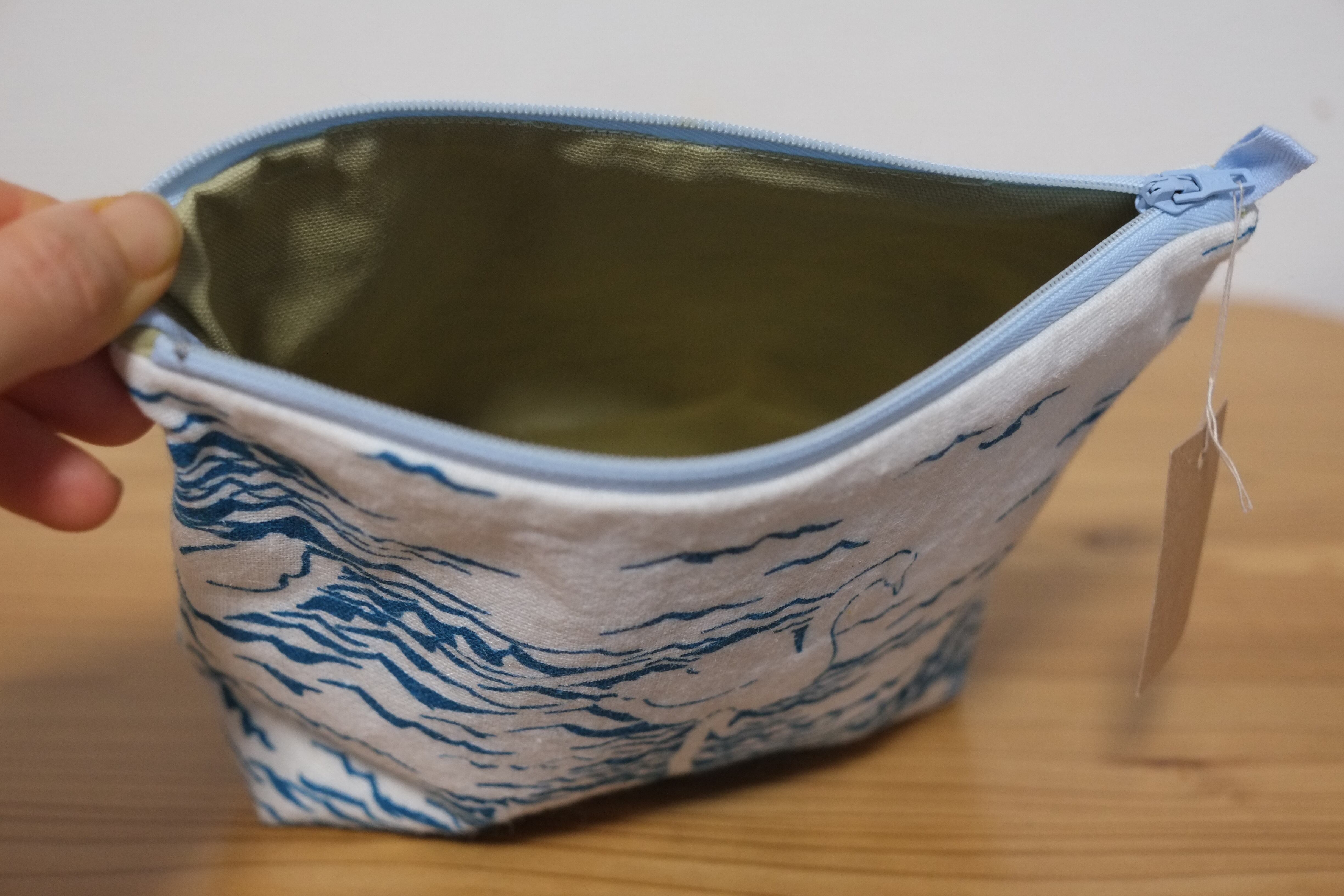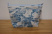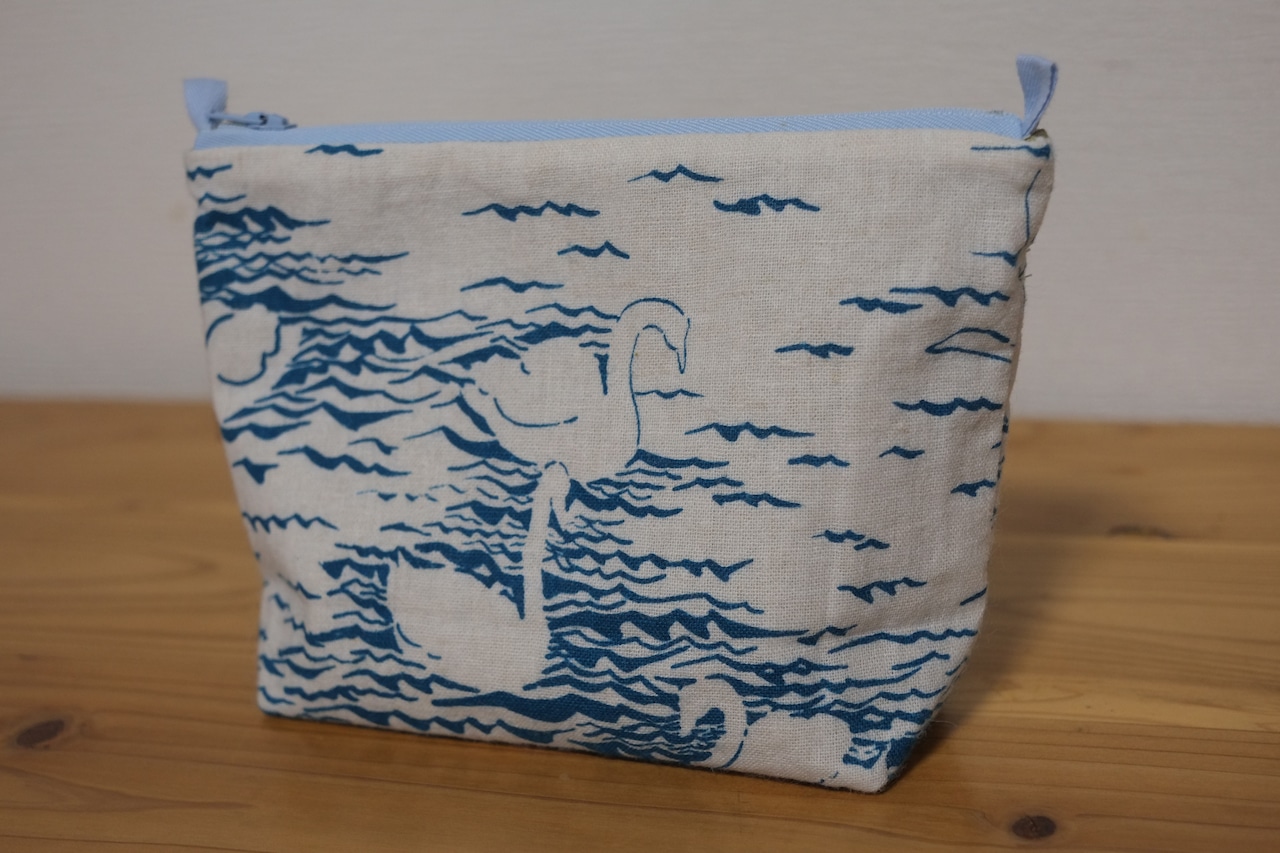 たくさんの白鳥が浮かぶ湖を染めた布をポーチに仕立てました。